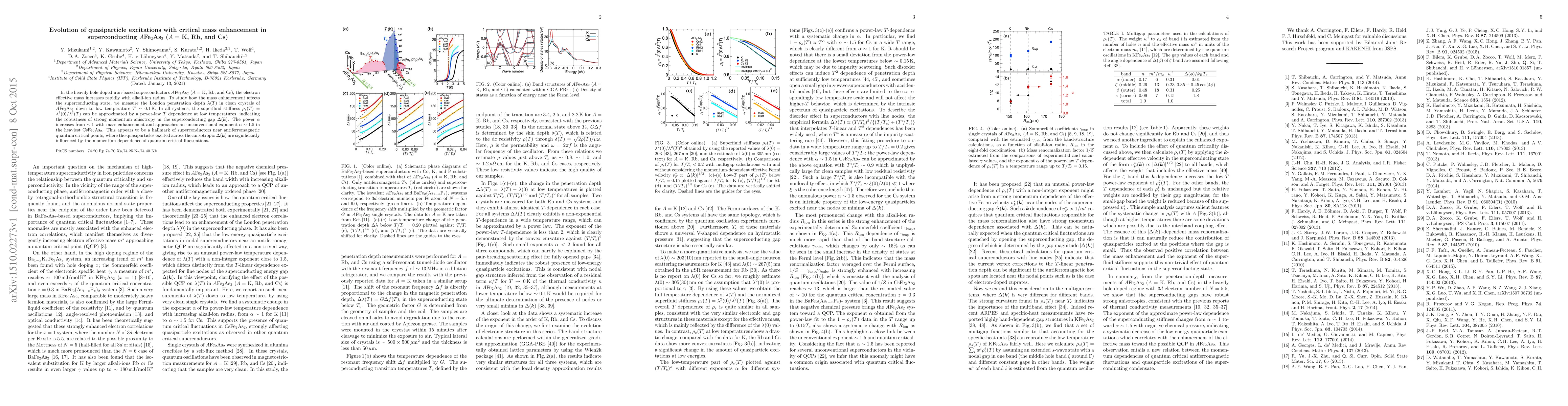 The study examines the impact of electron effective mass increase on superconductivity in AFe2As2 (A=K, Rb, Cs). By measuring the London penetration depth, researchers found that superfluid stiffness follows a power-law T dependence at low temperatures, revealing robust momentum anisotropy in the superconducting gap. The power u2018αu2019 increases with mass enhancement, approaching an unconventional 1.5 in CsFe2As2, suggesting proximity to antiferromagnetic quantum critical points.