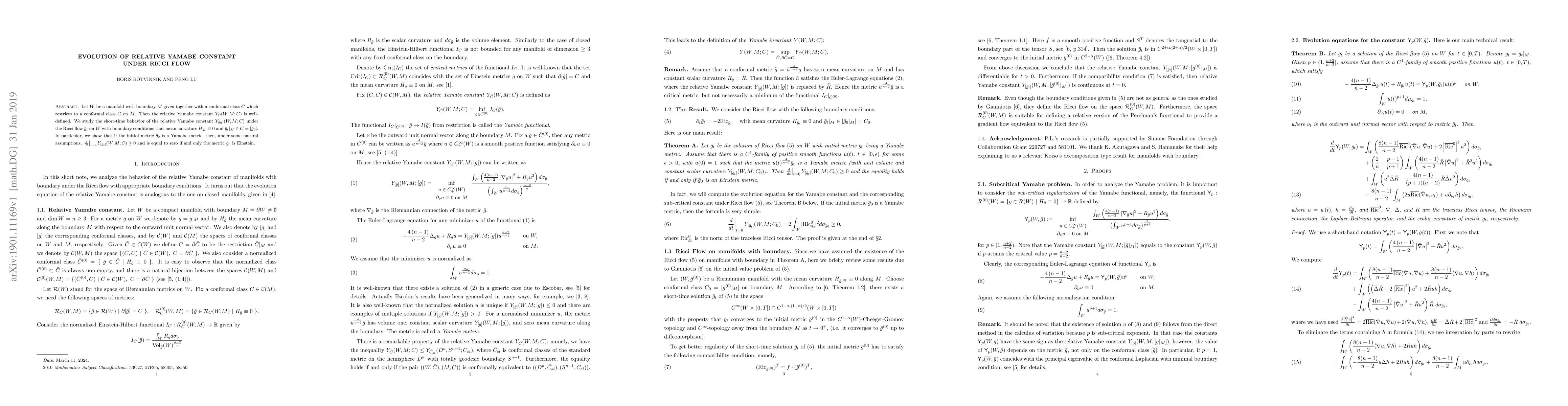 This paper studies the short-time behavior of the relative Yamabe constant under Ricci flow on a manifold with boundary, showing that it evolves non-decreasingly and equals zero if and only if the initial metric is Einstein.