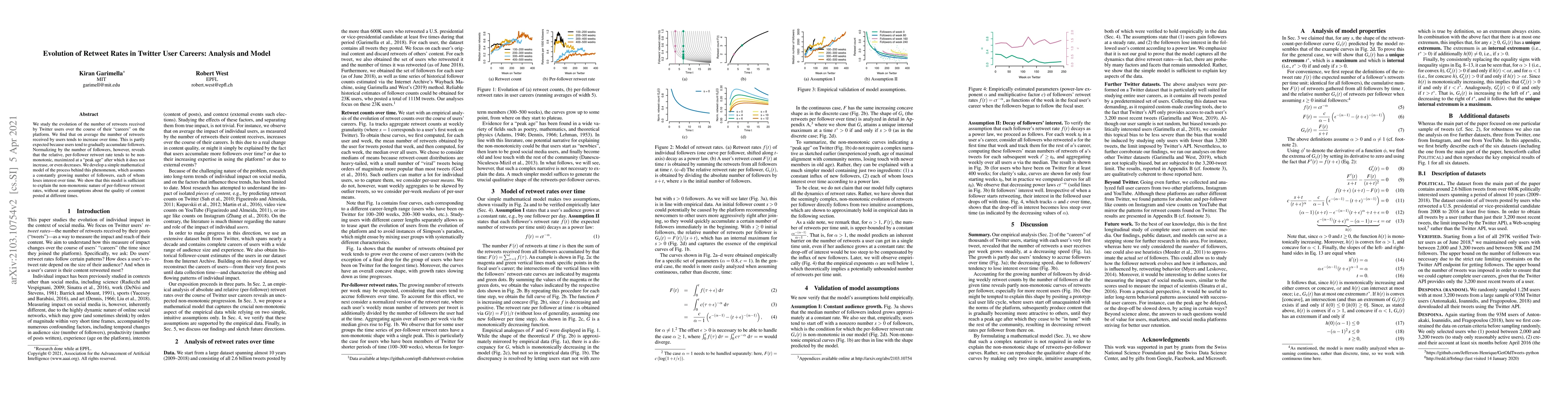 The research examines Twitter users' retweet trends over their 'careers', finding that while raw retweets increase over time due to growing followers, per-follower retweets peak at a 'peak age' and then decline. A simple model assuming constant follower growth and decreasing engagement over time explains this pattern, suggesting content quality fluctuations aren't necessary to understand retweet dynamics.