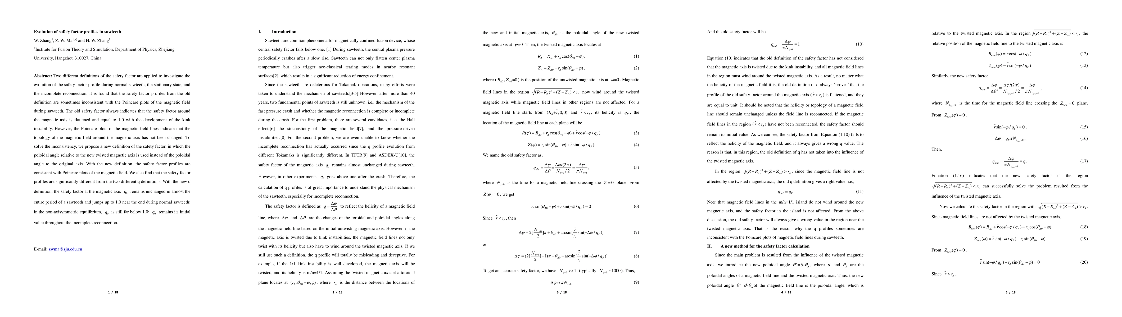 The paper proposes a new definition of safety factor, resolving inconsistencies between old definitions and Poincare plots of magnetic field during sawteeth. The new definition, based on a twisted magnetic axis, aligns safety factor profiles with magnetic field topology, revealing that the safety factor at the magnetic axis remains largely unchanged throughout sawtooth periods, except for a jump to 1.0 at the end of normal sawteeth.