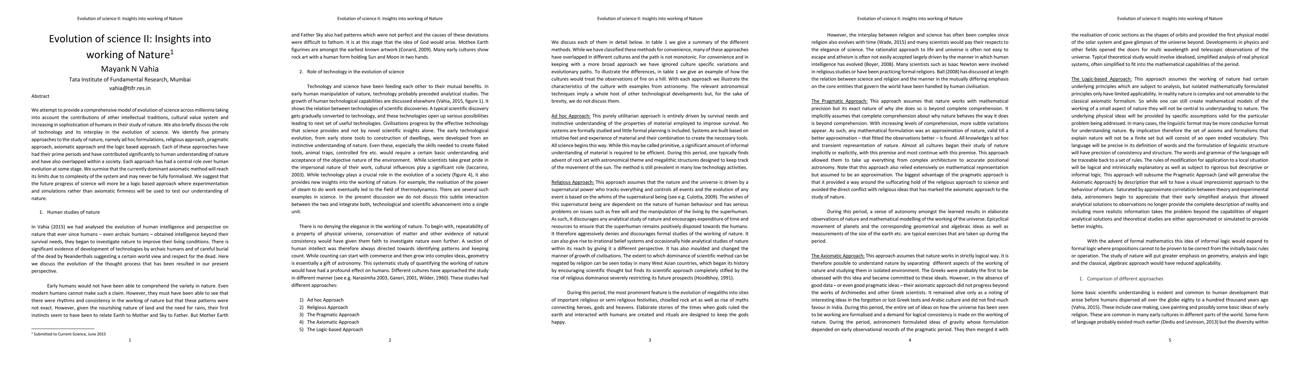 We attempt to provide a comprehensive model of evolution of science across millennia taking into account the contributions of other intellectual traditions, cultural value system and increasing in sophistication of humans in their study of nature. We also briefly discuss the role of technology and its interplay in the evolution of science. We identify five primary approaches to the study of nature, namely ad hoc formulations, religious approach, pragmatic approach, axiomatic approach and the logic based approach. Each of these approaches have had their prime periods and have contributed significantly to human understanding of nature and have also overlapped within a society. Each approach has had a central role over human evolution at some stage. We surmise that the currently dominant axiomatic method will reach its limits due to complexity of the system and may never be fully formalised. We suggest that the future progress of science will more be a logic based approach where experimentation and simulations rather than axiomatic firmness will be used to test our understanding of nature.