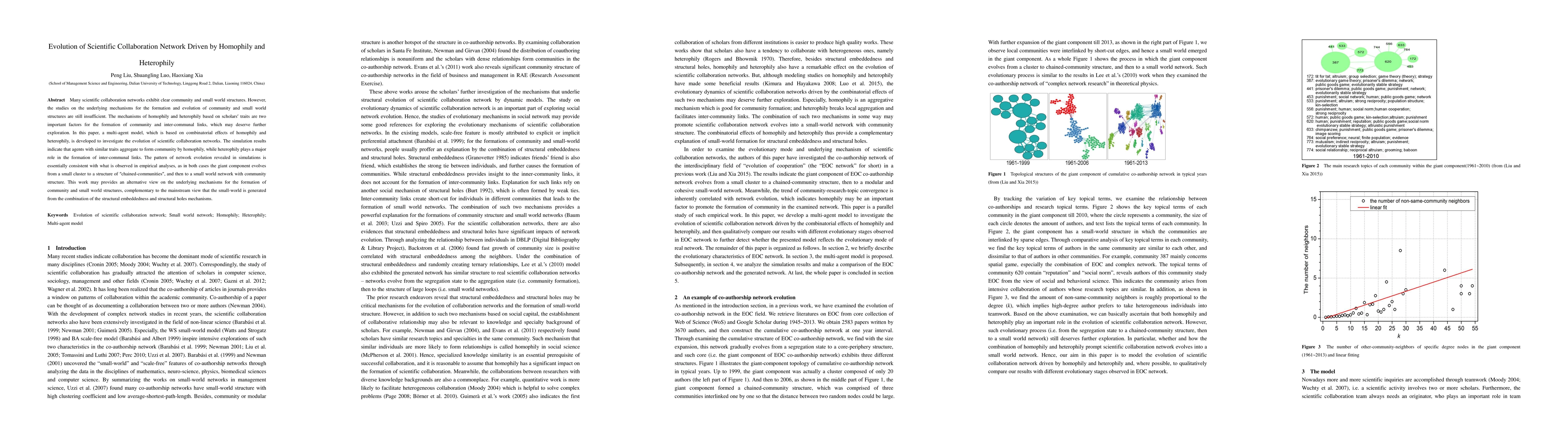 This paper develops a multi-agent model to explore how homophily and heterophily drive the evolution of scientific collaboration networks. Results show that homophily forms communities, while heterophily creates inter-communal links, leading to a network evolving from small clusters to chained-communities and finally to a small world network.