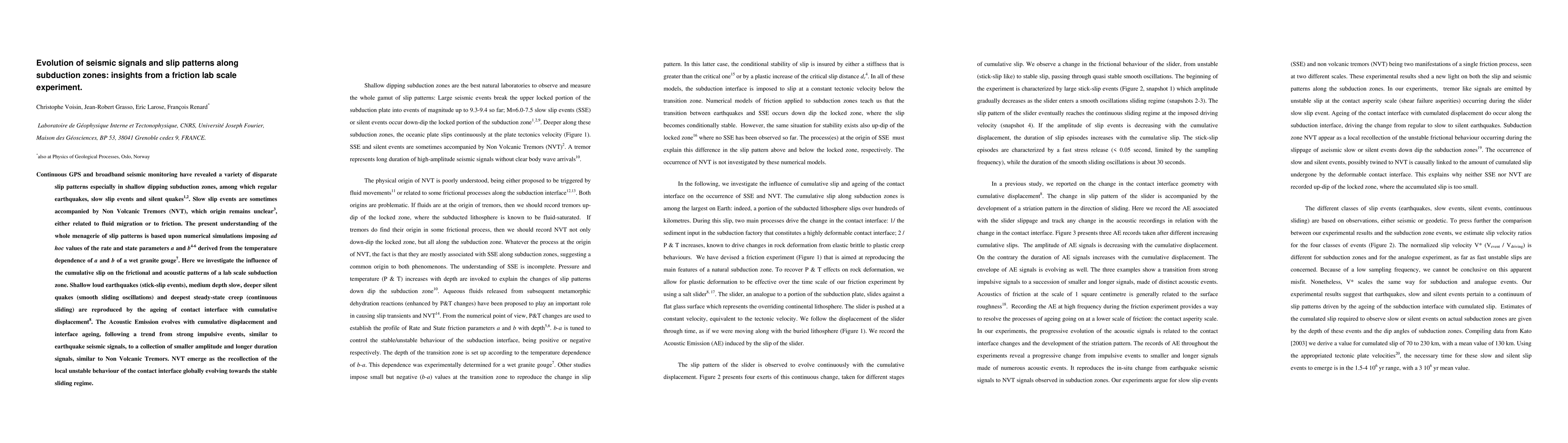 This study investigates the evolution of seismic signals and slip patterns in subduction zones through lab scale experiments, revealing that varying slip patterns—from shallow earthquakes to deep silent quakes—are influenced by the cumulative displacement and aging of contact interfaces. Acoustic emissions transition from impulsive earthquake-like signals to longer-duration tremors, indicating that Non Volcanic Tremors emerge from local unstable interface behavior transitioning to stable sliding.