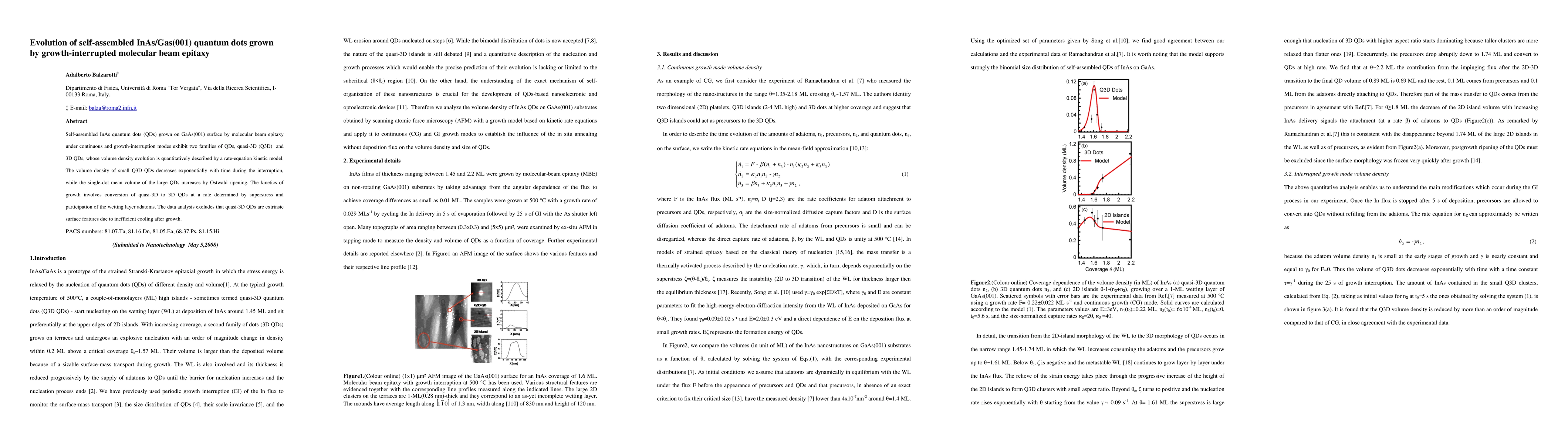 This paper investigates the evolution of self-assembled InAs/GaAs quantum dots (QDs) under continuous and interrupted molecular beam epitaxy, revealing two families of QDs: quasi-3D and 3D. The study uses a rate-equation kinetic model to describe the volume density changes, showing that small quasi-3D QDs decrease while large QDs grow via Ostwald ripening.