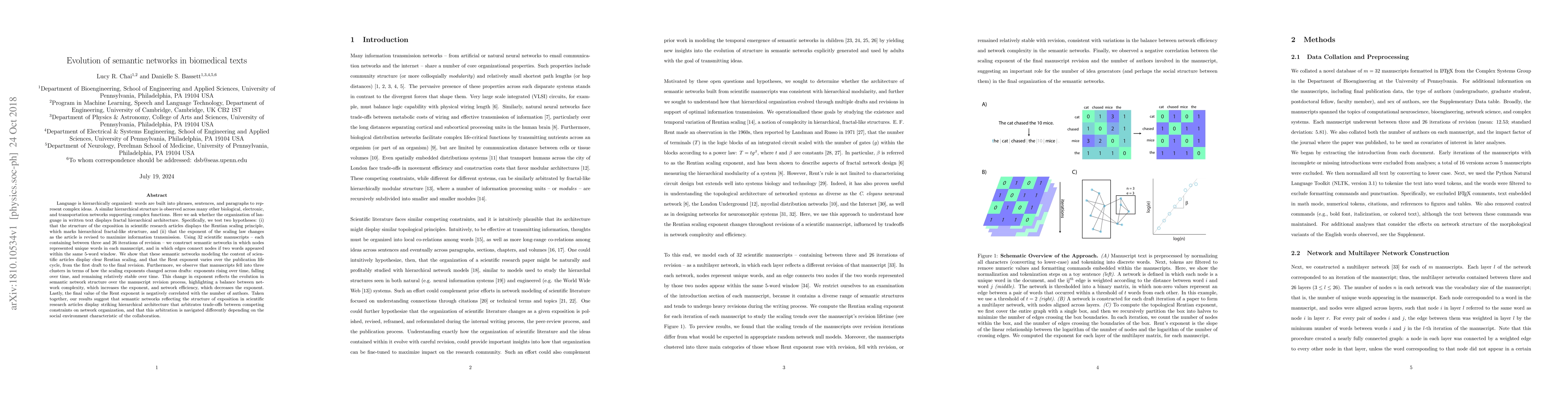 Language is hierarchically organized: words are built into phrases, sentences, and paragraphs to represent complex ideas. Here we ask whether the organization of language in written text displays the fractal hierarchical architecture common in systems optimized for efficient information transmission. We test the hypothesis that the expositional structure of scientific research articles displays Rentian scaling, and that the exponent of the scaling law changes as the article's information transmission capacity changes. Using 32 scientific manuscripts - each containing between three and 26 iterations of revision - we construct semantic networks in which nodes represented unique words in each manuscript, and edges connect nodes if two words appeared within the same 5-word window. We show that these semantic networks display clear Rentian scaling, and that the Rent exponent varies over the publication life cycle, from the first draft to the final revision. Furthermore, we observe that manuscripts fell into three clusters in terms of how the scaling exponents changed across drafts: exponents rising over time, falling over time, and remaining relatively stable over time. This change in exponent reflects the evolution in semantic network structure over the manuscript revision process, highlighting a balance between network complexity, which increases the exponent, and network efficiency, which decreases the exponent. Lastly, the final value of the Rent exponent is negatively correlated with the number of authors. Taken together, our results suggest that semantic networks reflecting the structure of exposition in scientific research articles display striking hierarchical architecture that arbitrates tradeoffs between competing constraints on network organization, and that this arbitration is navigated differently depending on the social environment characteristic of the collaboration.