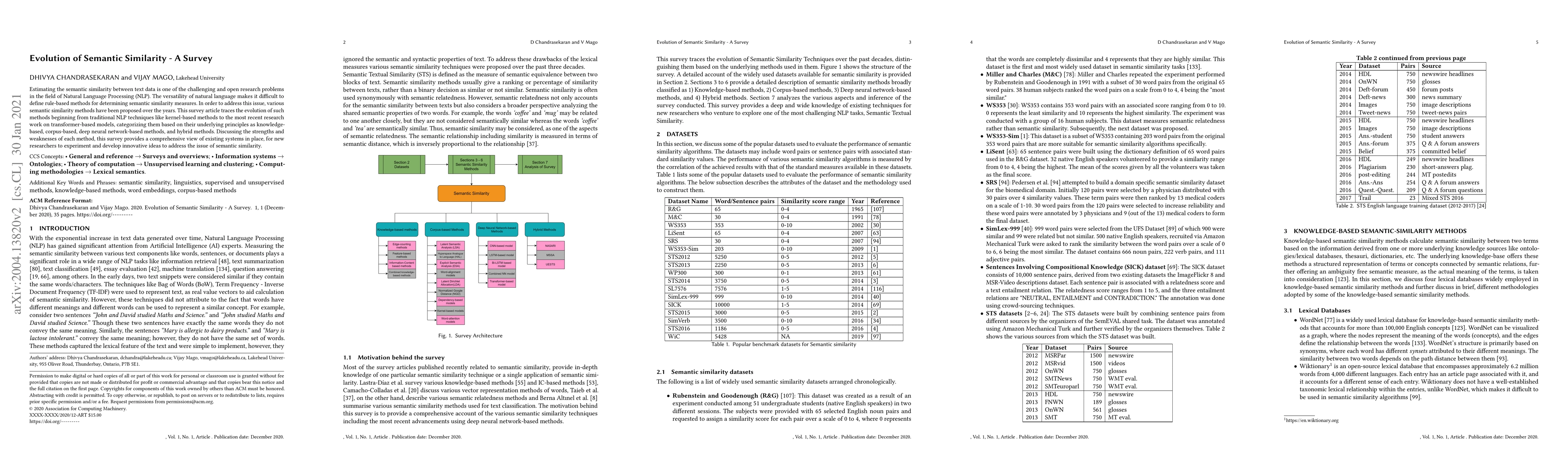 This paper surveys the evolution of semantic similarity methods in NLP, categorizing them into knowledge-based, corpus-based, deep neural network-based, and hybrid approaches. It discusses the strengths and weaknesses of each, offering a comprehensive overview for new researchers.