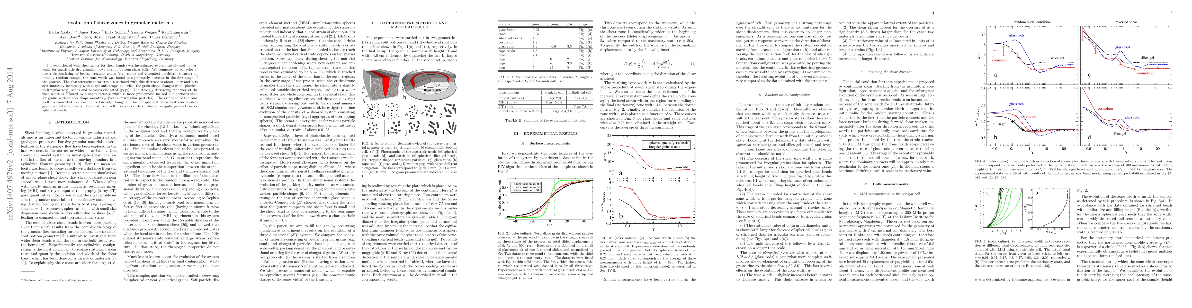 This study investigates the evolution of shear zones in granular materials through experimental and numerical analysis, finding that zone width decreases significantly initially, with the extent of this decrease linked to grain shape anisotropy. The final zone width is notably smaller for irregular grains compared to spherical beads.