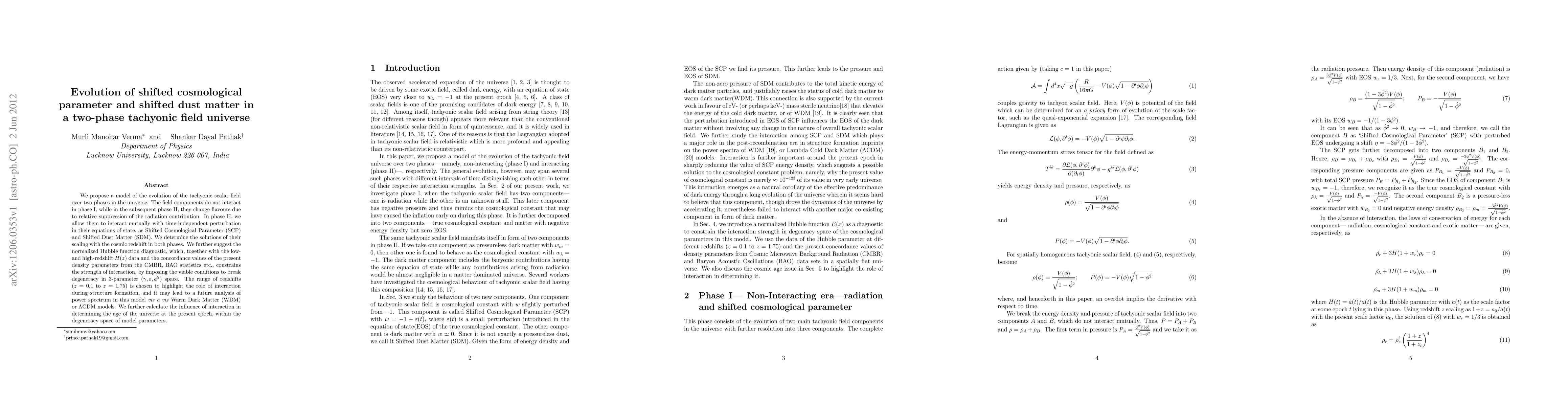 We propose a model of the evolution of the tachyonic scalar field over two phases in the universe. The field components do not interact in phase I, while in the subsequent phase II, they change flavours due to relative suppression of the radiation contribution. In phase II, we allow them to interact mutually with time-independent perturbation in their equations of state, as Shifted Cosmological Parameter (SCP) and Shifted Dust Matter (SDM). We determine the solutions of their scaling with the cosmic redshift in both phases. We further suggest the normalized Hubble function diagnostic, which, together with the low- and high-redshift $H(z)$ data and the concordance values of the present density parameters from the CMBR, BAO statistics etc., constrains the strength of interaction, by imposing the viable conditions to break degeneracy in 3-parameter $(\gamma, \varepsilon, \dot{\phi}^2)$ space. The range of redshifts $(z=0.1$ to $z=1.75)$ is chosen to highlight the role of interaction during structure formation, and it may lead to a future analysis of power spectrum in this model \emph{vis a vis} Warm Dark Matter (WDM) or $\Lambda$CDM models. We further calculate the influence of interaction in determining the age of the universe at the present epoch, within the degeneracy space of model parameters.
