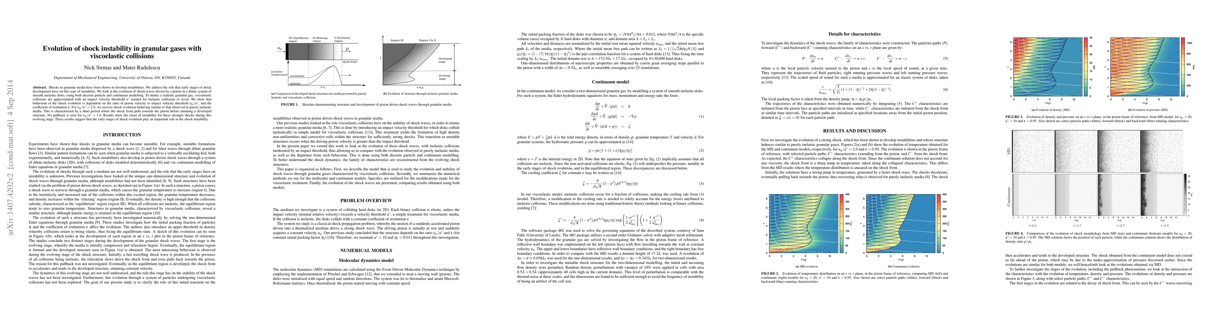 Shocks in granular media have been shown to develop instabilities. We address the role that early stages of shock development have on this type of instability. We look at the evolution of shock waves driven by a piston in a dilute system of smooth inelastic disks, using both discrete-particle and continuum modelling. To mimic a realistic granular gas, viscoelastic collisions are approximated with an impact velocity threshold $u^*$ needed for inelastic collisions to occur. We show that behaviour of the shock evolution is dependent on the ratio of piston velocity to impact velocity threshold $u_p/u^*$, and the coefficient of restitution $\varepsilon$. For $u_p/u^*=2.0$, we recover shock evolution behaving similar to that observed in purely inelastic media. This is characterized by a short period where the shock front pulls towards the piston before attaining a developed structure. No pullback is seen for $u_p/u^*=1.0$. Results show the onset of instability for these stronger shocks during this evolving stage. These results suggest that the early stages of shock evolution play an important role in the shock instability.