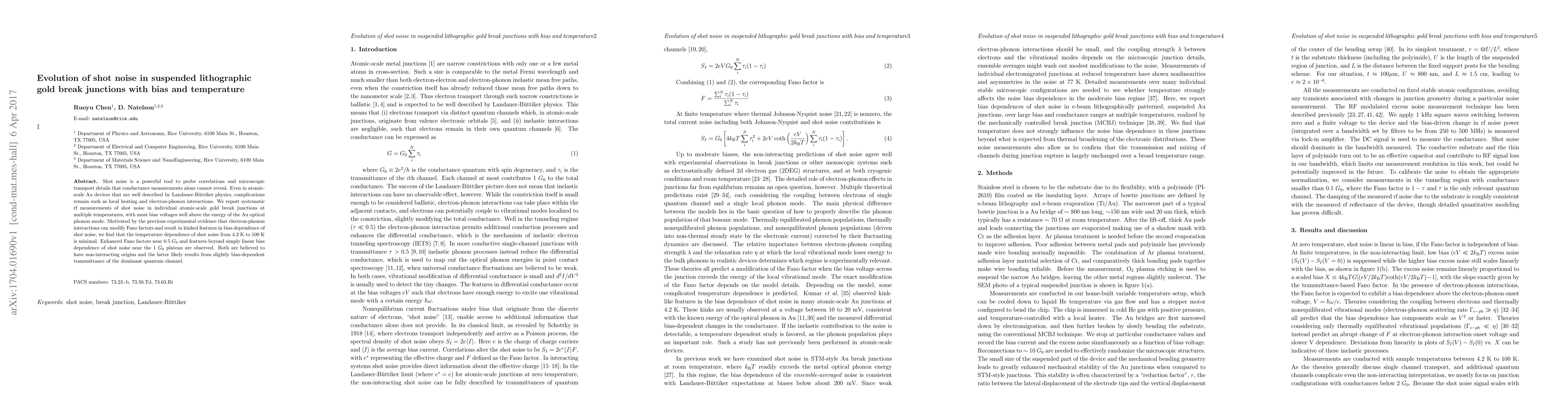 This study investigates shot noise in atomic-scale gold break junctions to reveal microscopic transport details, finding minimal temperature dependence and enhanced Fano factors near 0.5$~G_0$, suggesting non-interacting origins and bias-dependent quantum channel transmittance.