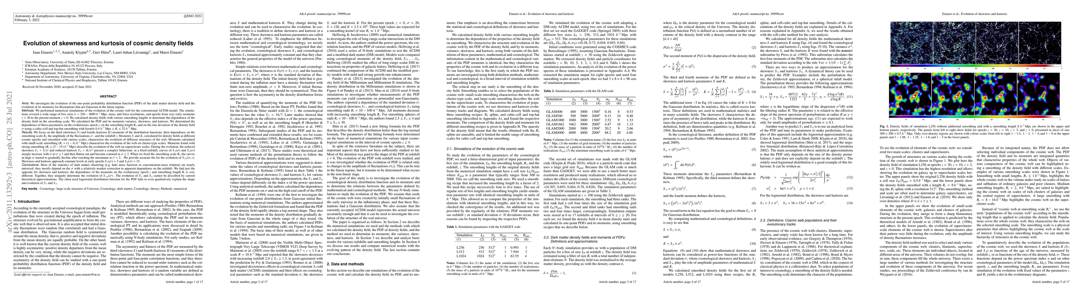 Methods. We perform numerical simulations of the evolution of the cosmic web for the conventional LCDM model. The simulations cover a wide range of box sizes L = 256 - 4000 Mpc/h, mass and force resolutions and epochs from very early moments z = 30 to the present moment z = 0. We calculate density fields with various smoothing lengths to find the dependence of the density field on smoothing scale. We calculate PDF and its moments - variance, skewness and kurtosis. Results. We focus on the third (skewness S) and fourth (kurtosis K) moments of the distribution functions: their dependence on the smoothing scale, the amplitude of fluctuations and the redshift. During the evolution the reduced skewness $S_3= S/\sigma$ and reduced kurtosis $S_4=K/\sigma^2$ present a complex behaviour: at a fixed redshift curves of $S_3(\sigma)$ and $S_4(\sigma)$ steeply increase with $\sigma$ at $\sigma\le 1$ and then flatten out and become constant at $\sigma\ge2$. If we fix the smoothing scale $R_t$, then after reaching the maximum at $\sigma\approx 2$, the curves at large $\sigma$ start to gradually decline. We provide accurate fits for the evolution of $S_{3,4}(\sigma,z)$. Skewness and kurtosis approach at early epochs constant levels, depending on smoothing length: $S_3(\sigma) \approx 3$ and $S_4(\sigma) \approx 15$. Conclusions. Most of statistics of dark matter clustering (e.g., halo mass function or concentration-mass relation) are nearly universal: they mostly depend on the $\sigma$ with the relatively modest correction to explicit dependence on the redshift. We find just the opposite for skewness and kurtosis: the dependence of moments on evolutionary epoch $z$ and smoothing length $R_t$ is very different, together they determine the evolution of $S_{3,4}(\sigma)$ uniquely. The evolution of $S_3$ and $S_4$ cannot be described by current theoretical approximations.