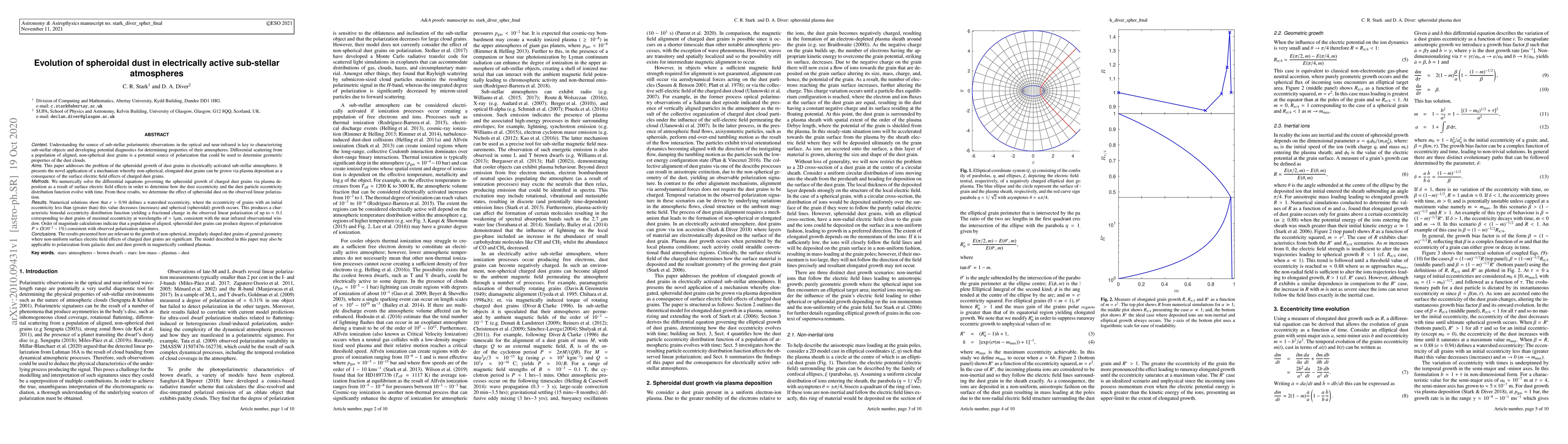 This paper investigates the evolution of spheroidal dust grains in electrically active sub-stellar atmospheres, focusing on the growth mechanism via plasma deposition influenced by surface electric fields. The study reveals a critical eccentricity of $e\approx 0.94$ that determines the transition from spherical to spheroidal growth, leading to a bimodal eccentricity distribution and a fractional change in observed linear polarization of up to $\approx0.1$ in the near-infrared.