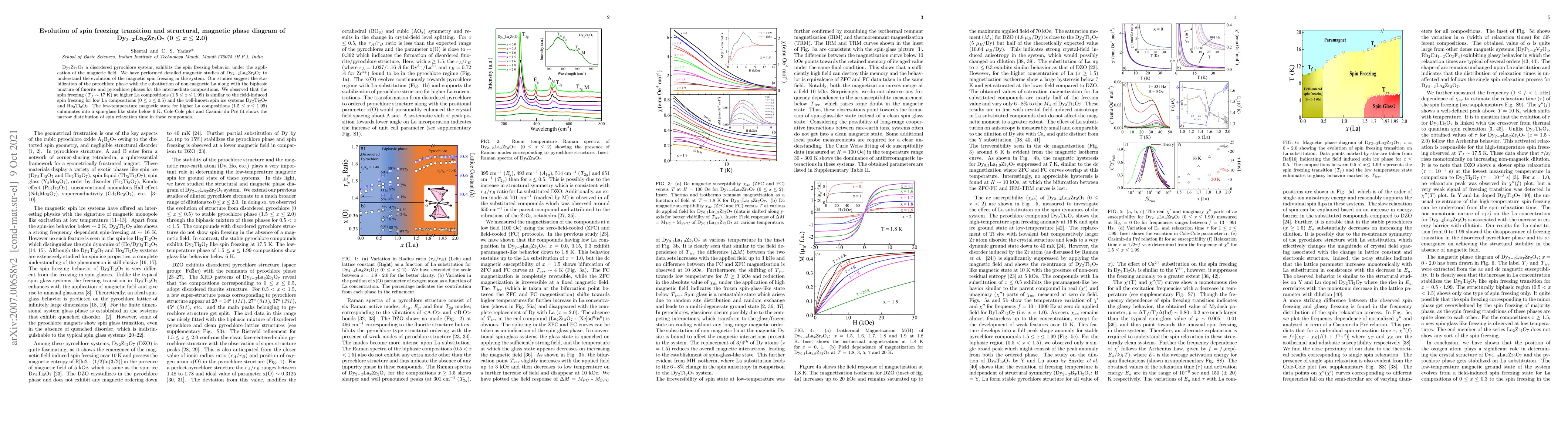 Dy$_{2}$Zr$_{2}$O$_{7}$ a disordered pyrochlore system, exhibits the spin ice freezing under the application of magnetic field. Our studies suggest the stabilization of pyrochlore phase in Dy$_{2-x}$La$_{x}$Zr$_{2}$O$_{7}$ with the substitution of nonmagnetic La, along with the biphasic mixture for the intermediate compositions. We observed that the higher La compositions (1.5 $\leq$ x $\leq$ 1.9), show spin freezing (T $\sim$ 17 K) similar to the field induced spin ice freezing for low La compositions (0 $\leq$ x $\leq$ 0.5), and the well known spin ice systems Dy$_{2}$Ti$_{2}$O$_{7}$ and Ho$_{2}$Ti$_{2}$O$_{7}$. The low temperature magnetic state for higher La compositions (1.5 $\leq$ x $\leq$ 1.9) culminates into spin glass state below 6 K. The Cole-Cole plot and Casimir-du Pr$\acute{e}$ fit shows narrow distribution of spin relaxation time in these compounds.