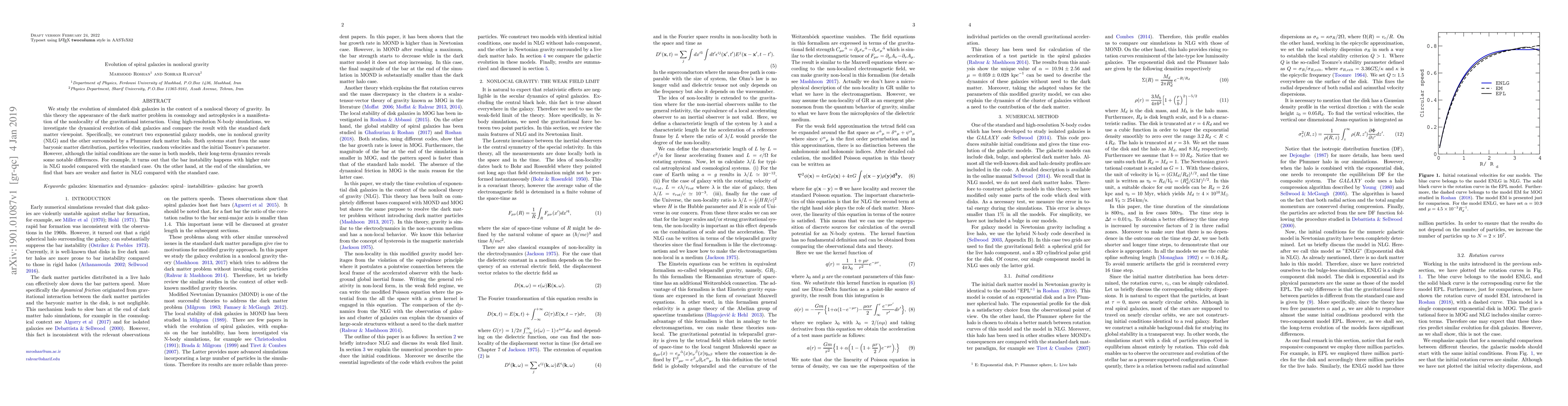 We study the evolution of simulated disk galaxies in the context of a nonlocal theory of gravity. In this theory the appearance of the dark matter problem in cosmology and astrophysics is a manifestation of the nonlocality of the gravitational interaction. Using high-resolution N-body simulations, we investigate the dynamical evolution of disk galaxies and compare the result with the standard dark matter viewpoint. Specifically, we construct two exponential galaxy models, one in nonlocal gravity (NLG) and the other surrounded by a Plummer dark matter halo. Both systems start from the same baryonic matter distribution, particles velocities, random velocities and the initial Toomre's parameter. However, although the initial conditions are the same in both models, their long-term dynamics reveals some notable differences. For example, it turns out that the bar instability happens with higher rate in NLG model compared with the standard case. On the other hand, at the end of the simulation, we find that bars are weaker and faster in NLG compared with the standard case.