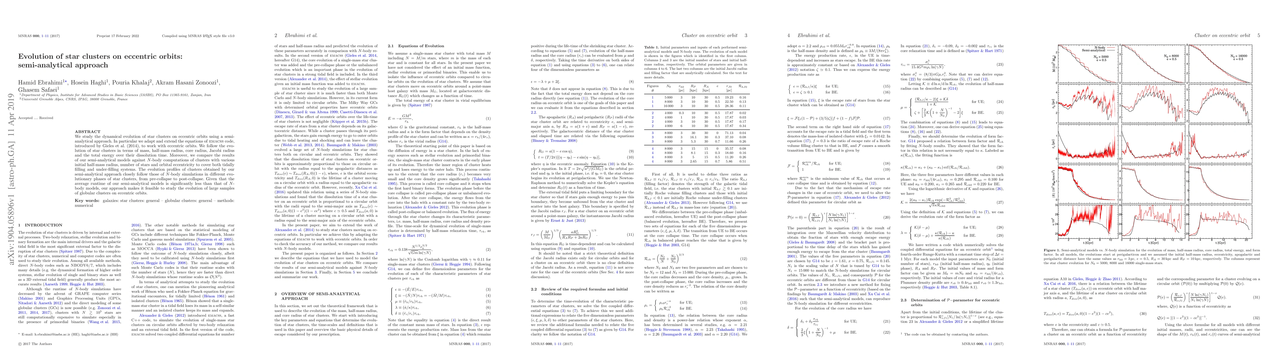 This paper employs a semi-analytical approach to study the dynamical evolution of star clusters on eccentric orbits, adapting and extending the EMACSS code to cover these scenarios. The results closely match those from $N$-body simulations, making the semi-analytical method more efficient for studying large samples of globular clusters.