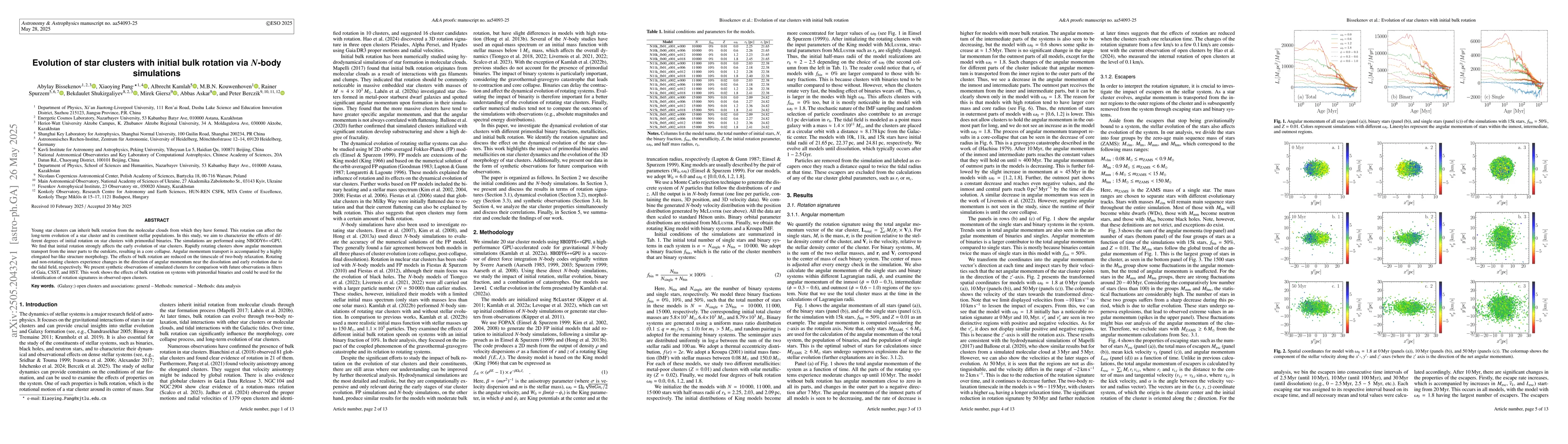 The study uses N-body simulations with NBODY6++GPU to model the evolution of star clusters with initial bulk rotation and primordial binaries.