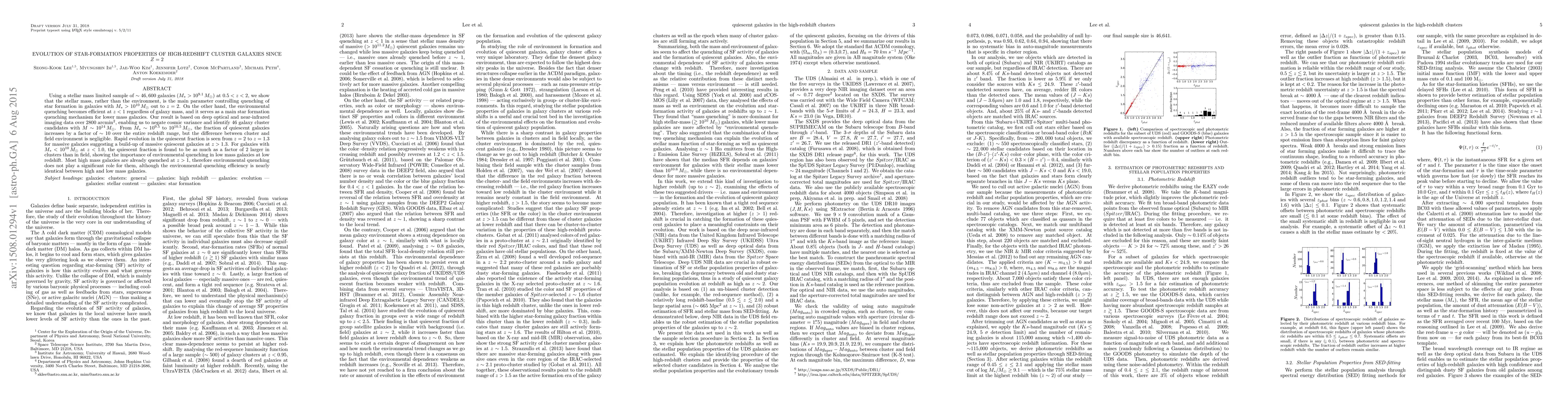 Using a stellar mass limited sample of $\sim 46,600$ galaxies ($M_* > 10^{9.1}\,M_{\odot}$) at $0.5 < z < 2$, we show that the tellar mass, rather than the environment, is the main parameter controlling quenching of star formation in galaxies with $M_* > 10^{10}\,M_{\odot}$ out to $z=2$. On the other hand, the environmental quenching becomes efficient at $z < 1$ regardless of galaxy mass, and it serves as a main star formation quenching mechanism for lower mass galaxies. Our result is based on deep optical and near-infrared imaging data over 2800 arcmin$^2$, enabling us to negate cosmic variance and identify 46 galaxy cluster candidates with $M \sim 10^{14}\,M_{\odot}$. From $M_* \sim 10^{9.5}$ to $10^{10.5}\,M_{\odot}$, the fraction of quiescent galaxies increases by a factor of $\sim 10$ over the entire redshift range, but the difference between cluster and field environment is negligible. Rapid evolution in the quiescent fraction is seen from $z=2$ to $z=1.3$ for massive galaxies suggesting a build-up of massive quiescent galaxies at $z > 1.3$. For galaxies with $M_* < 10^{10}\,M_{\odot}$ at $z < 1.0$, the quiescent fraction is found to be as much as a factor of 2 larger in clusters than in field, showing the importance of environmental quenching in low mass galaxies at low redshift. Most high mass galaxies are already quenched at $z > 1$, therefore environmental quenching does not play a significant role for them, although the environmental quenching efficiency is nearly identical between high and low mass galaxies.
