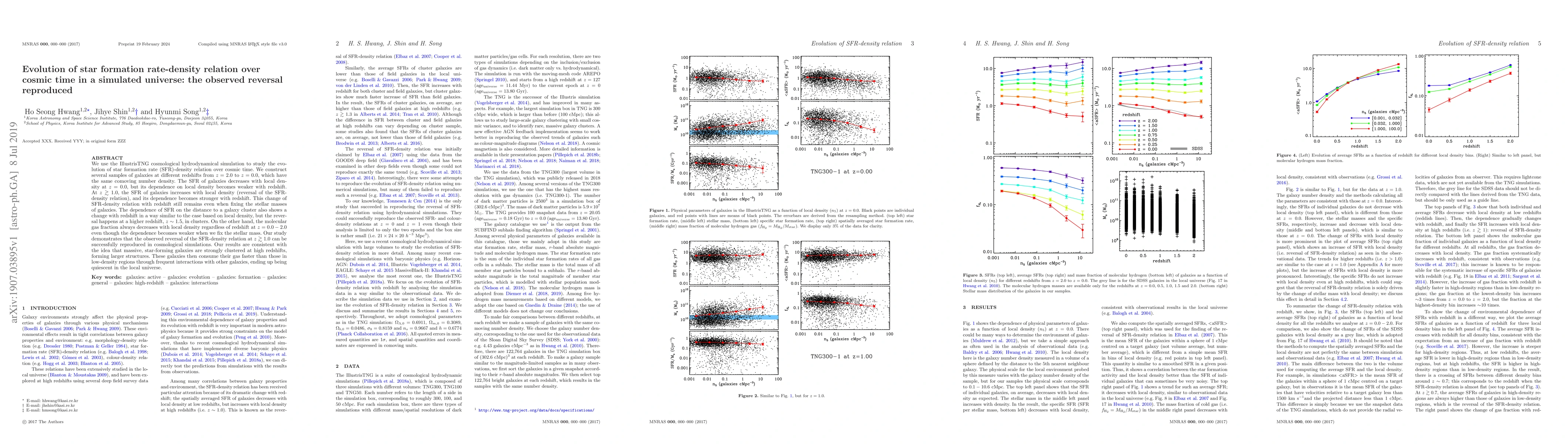 This study uses the IllustrisTNG simulation to show that the star formation rate (SFR)-density relation reverses at high redshifts ($z\gtrsim1.0$), where SFR increases with local density, but this trend weakens at lower redshifts. The reversal is consistent with massive, star-forming galaxies forming larger structures and consuming gas faster through interactions, leading to quiescence in the local universe.