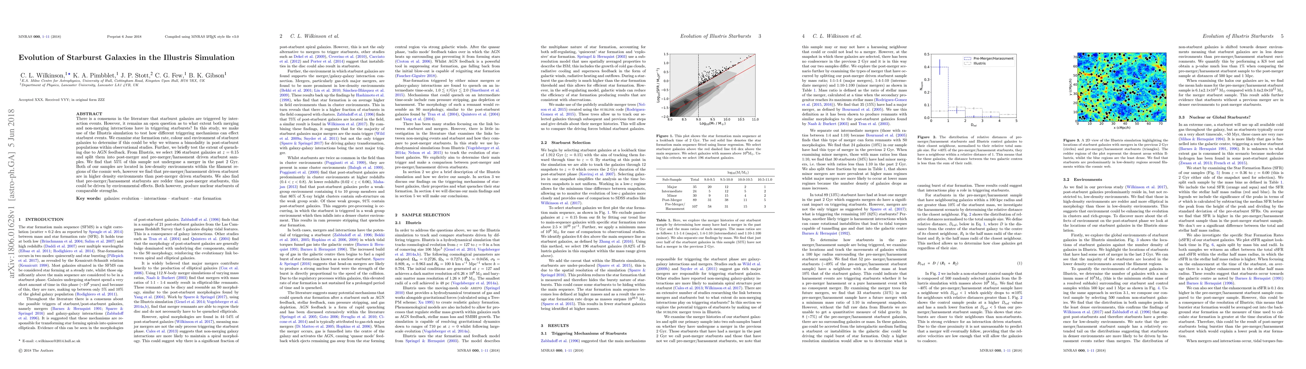 There is a consensus in the literature that starburst galaxies are triggered by inter- action events. However, it remains an open question as to what extent both merging and non-merging interactions have in triggering starbursts? In this study, we make use of the Illustris simulation to test how different triggering mechanisms can effect starburst events. We examine star formation rate, colour and environment of starburst galaxies to determine if this could be why we witness a bimodality in post-starburst populations within observational studies. Further, we briefly test the extent of quenching due to AGN feedback. From Illustris, we select 196 starburst galaxies at z = 0.15 and split them into post-merger and pre-merger/harassment driven starburst samples. We find that 55% of this sample not undergone a merger in the past 2 Gyr. Both of our samples are located in low-density environments within the filament regions of the cosmic web, however we find that pre-merger/harassment driven starburst are in higher density environments than post-merger driven starbursts. We also find that pre-merger/harassment starbursts are redder than post-merger starbursts, this could be driven by environmental effects. Both however, produce nuclear starbursts of comparable strengths.