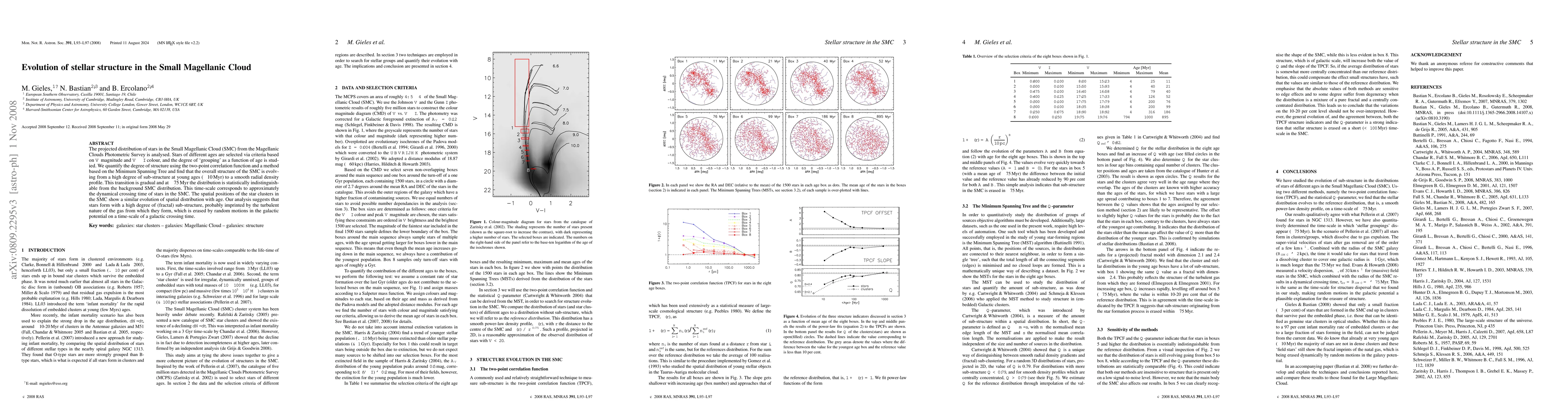 This study analyzes the evolution of stellar structure in the Small Magellanic Cloud (SMC) using photometric survey data, revealing that young stars (~10 Myr) exhibit significant sub-structure, which gradually diminishes over time to form a smooth radial density profile by ~75 Myr. The transition mirrors the dynamical crossing time of stars in the SMC.