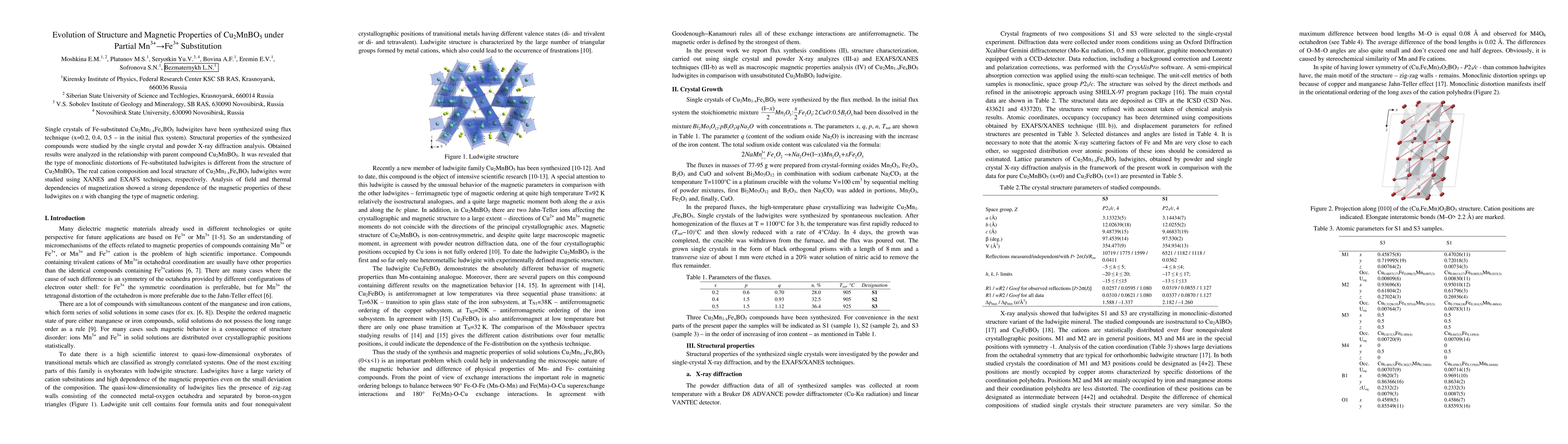 Single crystals of Fe-substituted Cu2Mn1-xFexBO5 ludwigites have been synthesized using flux technique (x=0.2, 0.4, 0.5 - in the initial flux system). Structural properties of the synthesized compounds were studied by the single crystal and powder X-ray diffraction analysis. Obtained results were analyzed in the relationship with parent compound Cu2MnBO5. It was revealed that the type of monoclinic distortions of Fe-substituted ludwigites is different from the structure of Cu2MnBO5. The real cation composition and local structure of Cu2Mn1-xFexBO5 ludwigites were studied using XANES and EXAFS techniques, respectively. Analysis of field and thermal dependencies of magnetization showed a strong dependence of the magnetic properties of these ludwigites on x with changing the type of magnetic ordering.