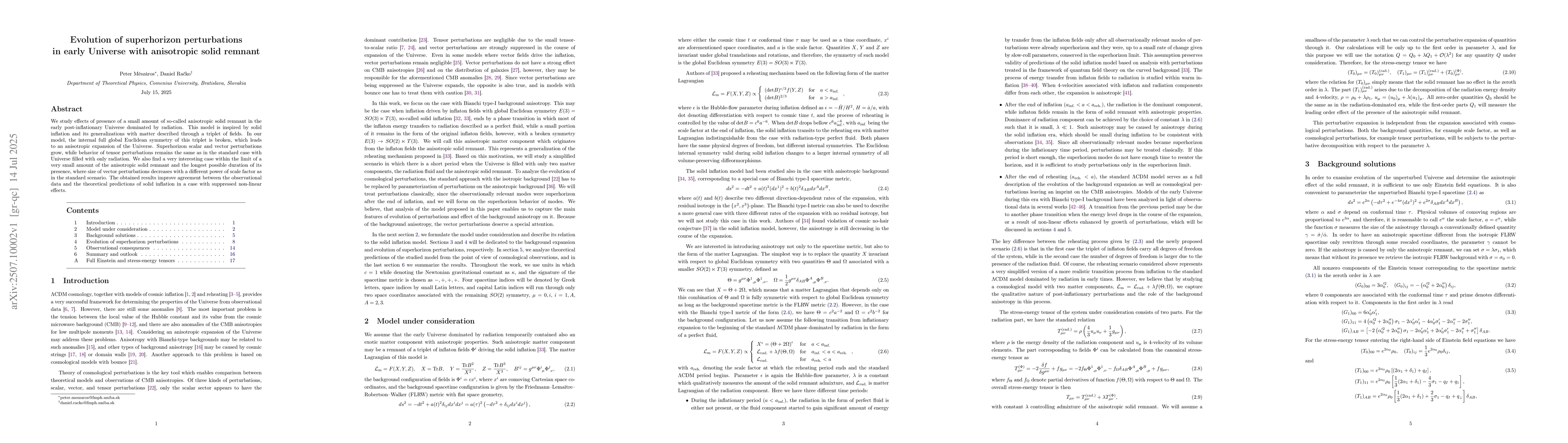 We study effects of presence of a small amount of so-called anisotropic solid remnant in the early post-inflationary Universe dominated by radiation. This model is inspired by solid inflation and its generalizations with matter described through a triplet of fields. In our model, the internal full global Euclidean symmetry of this triplet is broken, which leads to an anisotropic expansion of the Universe. Superhorizon scalar and vector perturbations grow, while behavior of tensor perturbations remains the same as in the standard case with Universe filled with only radiation. We also find a very interesting case within the limit of a very small amount of the anisotropic solid remnant and the longest possible duration of its presence, where size of vector perturbations decreases with a different power of scale factor as in the standard scenario. The obtained results improve agreement between the observational data and the theoretical predictions of solid inflation in a case with suppressed non-linear effects.