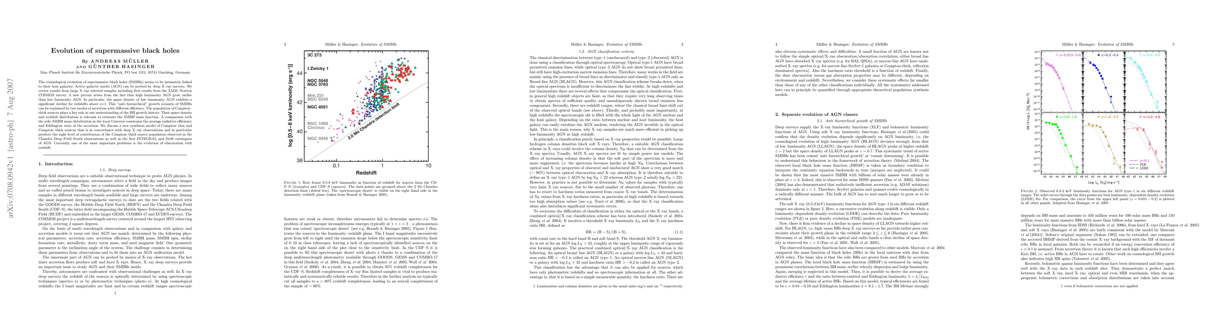 The cosmological evolution of supermassive black holes (SMBHs) seems to be intimately linked to their host galaxies. Active galactic nuclei (AGN) can be probed by deep X-ray surveys. We review results from large X-ray selected samples including first results from the XMM-Newton COSMOS survey. A new picture arises from the fact that high-luminosity AGN grow earlier than low-luminosity AGN. In particular, the space density of low-luminosity AGN exhibits a significant decline for redshifts above z=1. This 'anti--hierarchical' growth scenario of SMBHs can be explained by two modes of accretion with different efficiency. The population of Compton-thick sources plays a key role in our understanding of the BH growth history. Their space density and redshift distribution is relevant to estimate the SMBH mass function. A comparison with the relic SMBH mass distribution in the local Universe constrains the average radiative efficiency and Eddington ratio of the accretion. We discuss a new synthesis model of Compton-thin and Compton-thick sources that is in concordance with deep X-ray observations and in particular predicts the right level of contribution of the Compton-thick source population observed in the Chandra Deep Field South observations as well as the first INTEGRAL and Swift catalogues of AGN. Currently, one of the most important problems is the evolution of obscuration with redshift.