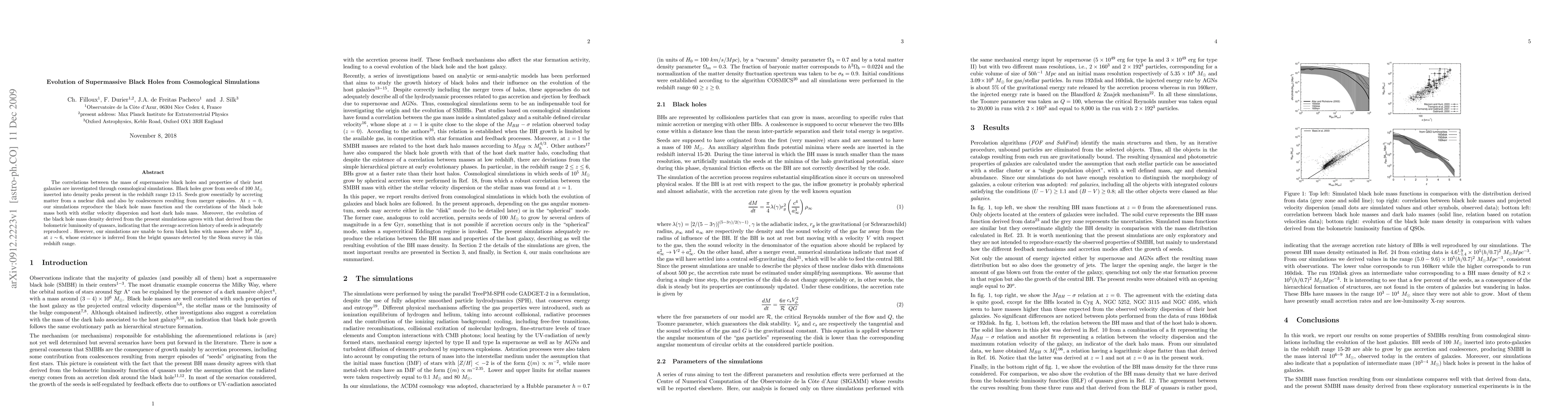 This paper explores the growth of supermassive black holes via cosmological simulations, showing that black holes develop from seeds of 100 solar masses and grow primarily through accretion and mergers. The simulations match observed correlations and mass functions at z=0 but fail to reproduce black holes exceeding $10^9 M_{\odot}$ at $z\sim 6$.