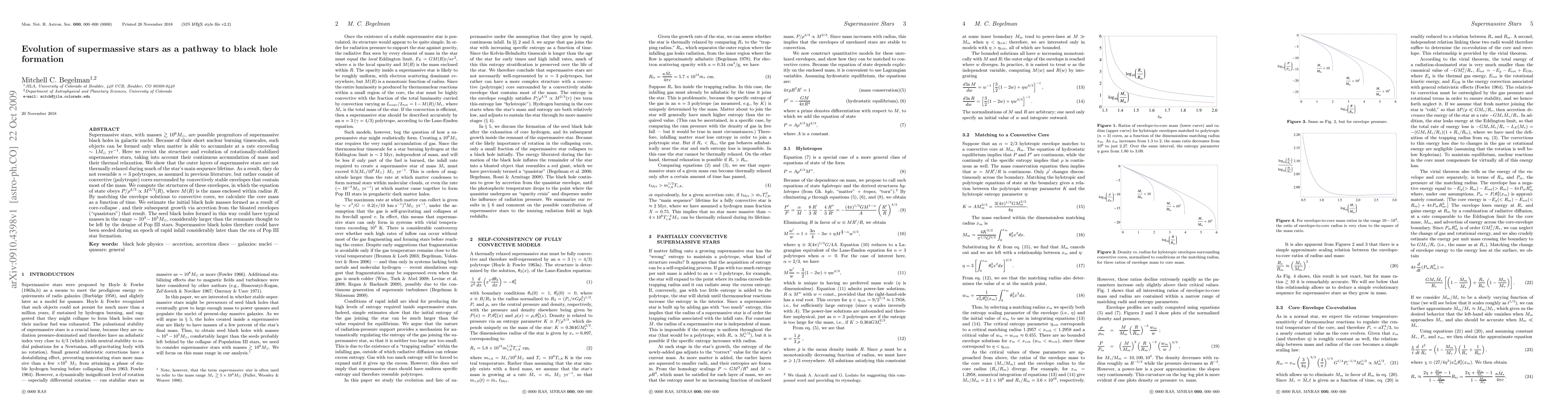 This paper explores the evolution of supermassive stars, which can accumulate mass rapidly enough to form supermassive black holes. It finds that these stars' outer layers remain convectively unstable, leading to structures different from previously assumed n=3 polytropes. The study estimates initial black hole masses in the range of 10^4-10^5 solar masses, suggesting supermassive black holes could form much later than the era of Population III star formation.