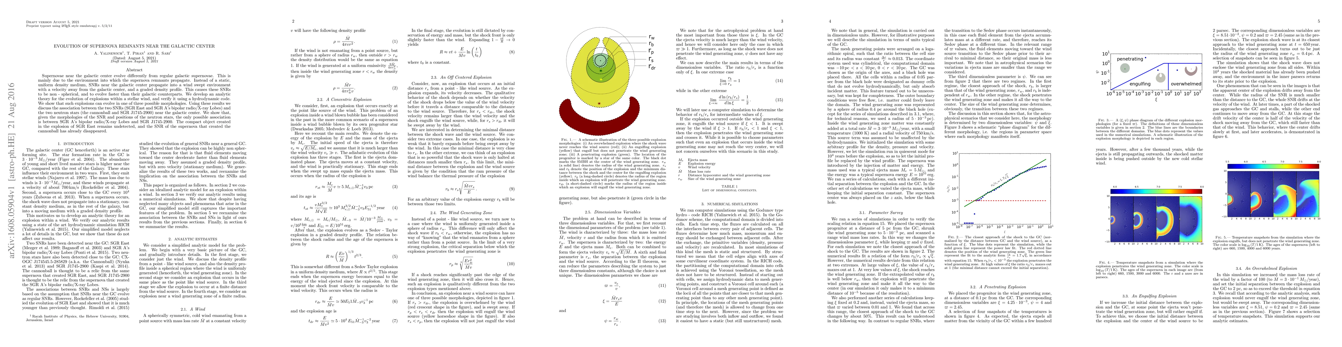 Supernovae near the galactic center evolve differently from regular galactic supernovae. This is mainly due to the environment into which the supernova remnants propagate. Instead of a static, uniform density medium, SNRs near the galactic center propagate into a wind swept environment with a velocity away from the galactic center, and a graded density profile. This causes these SNRs to be non - spherical, and to evolve faster than their galactic counterparts. We develop an analytic theory for the evolution of explosions within a stellar wind, and verify it using a hydrodynamic code. We show that such explosions can evolve in one of three possible morphologies. Using these results we discuss the association between the two SNRs (SGR East and SGR A's bipolar radio/X-ray Lobes) and the two neutron stars (the cannonball and SGR J1745-2900) near the galactic center. We show that, given the morphologies of the SNR and positions of the neutron stars, the only possible association is between SGR A's bipolar radio/X-ray Lobes and SGR J1745-2900. The compact object created in the explosion of SGR East remains undetected, and the SNR of the supernova that created the cannonball has already disappeared.