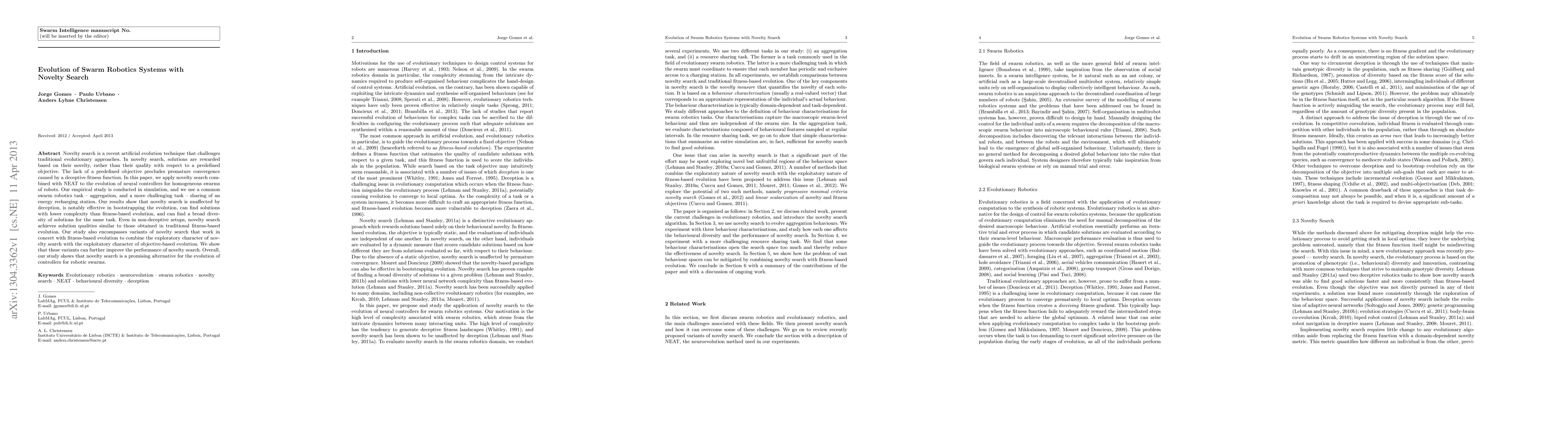 This paper explores the application of novelty search, an artificial evolution technique rewarding solutions based on novelty rather than predefined objectives, to evolve neural controllers for swarm robotics. The study demonstrates that novelty search effectively avoids premature convergence, finds diverse and less complex solutions, and achieves comparable performance to traditional fitness-based evolution, suggesting it as a promising alternative for swarm robotics.