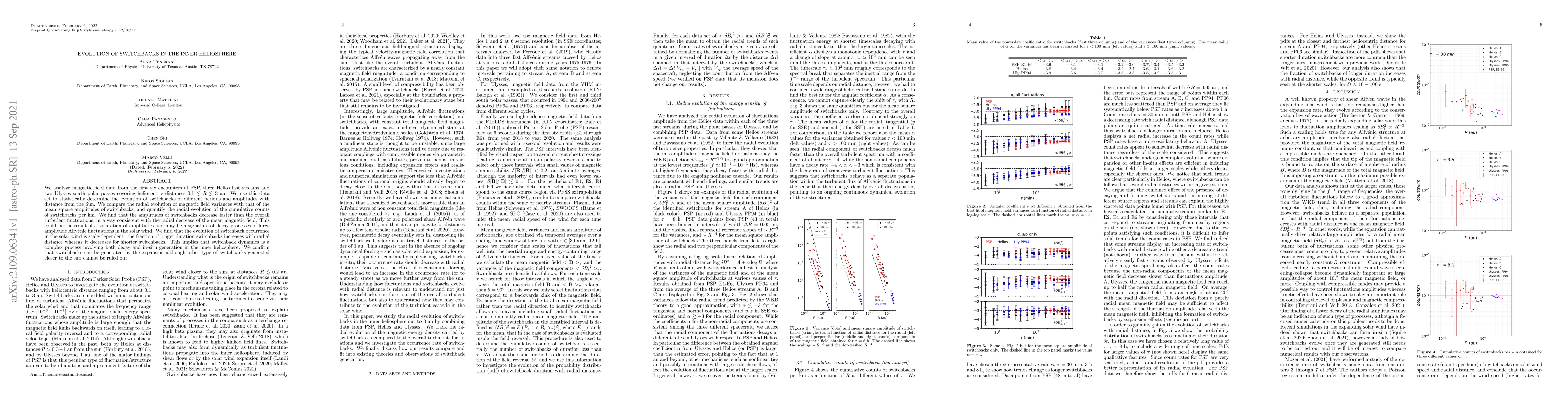 We analyze magnetic field data from the first six encounters of PSP, three Helios fast streams and two Ulysses south polar passes covering heliocentric distances $0.1\lesssim R\lesssim 3$ au. We use this data set to statistically determine the evolution of switchbacks of different periods and amplitudes with distance from the Sun. We compare the radial evolution of magnetic field variances with that of the mean square amplitudes of switchbacks, and quantify the radial evolution of the cumulative counts of switchbacks per km. We find that the amplitudes of switchbacks decrease faster than the overall turbulent fluctuations, in a way consistent with the radial decrease of the mean magnetic field. This could be the result of a saturation of amplitudes and may be a signature of decay processes of large amplitude Alfv\'enic fluctuations in the solar wind. We find that the evolution of switchback occurrence in the solar wind is scale-dependent: the fraction of longer duration switchbacks increases with radial distance whereas it decreases for shorter switchbacks. This implies that switchback dynamics is a complex process involving both decay and in-situ generation in the inner heliosphere. We confirm that switchbacks can be generated by the expansion although other type of switchbacks generated closer to the sun cannot be ruled out.