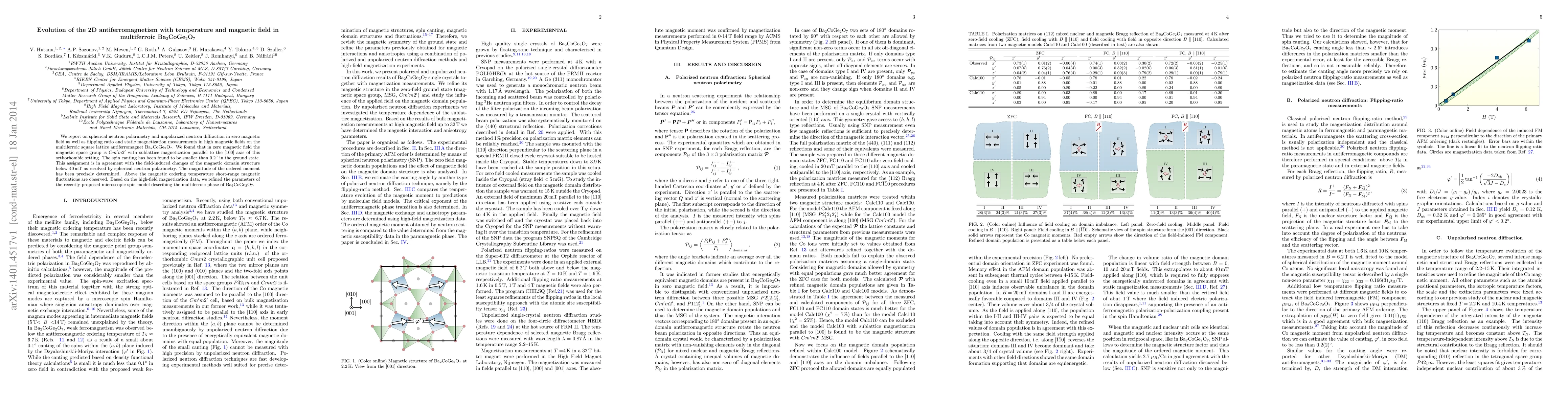 This paper investigates the temperature and magnetic field effects on the 2D antiferromagnetism in Ba$_2$CoGe$_2$O$_7$ using neutron polarimetry and diffraction, discovering a spin canting smaller than $0.2^\circ$ in zero field and refining a microscopic spin model to describe the multiferroic phase.