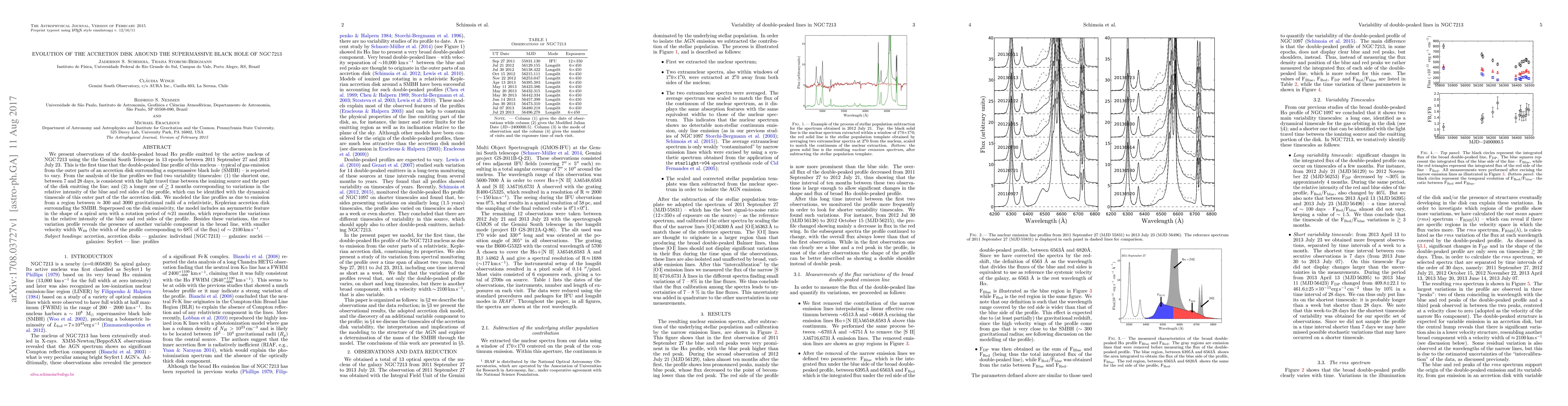 We present observations of the double-peaked broad H$\alpha$ profile emitted by the active nucleus of NGC 7213 using the the Gemini South Telescope in 13 epochs between 2011 September 27 and 2013 July 23. This is the first time that the double-peaked line profile of this nucleus -- typical of gas emission from the outer parts of an accretion disk surrounding a supermassive black hole (SMBH) -- is reported to vary. From the analysis of the line profiles we find two variability timescales: (1) the shortest one, between 7 and 28 days, is consistent with the light travel time between the ionizing source and the part of the disk emitting the line; and (2) a longer one of $\gtrsim 3$ months corresponding to variations in the relative intensity of the blue and red sides of the profile, which can be identified with the dynamical timescale of this outer part of the the accretion disk. We modeled the line profiles as due to emission from a region between $\approx$ 300 and 3000 gravitational radii of a relativistic, Keplerian accretion disk surrounding the SMBH. Superposed on the disk emissivity, the model includes an asymmetric feature in the shape of a spiral arm with a rotation period of $\approx$ 21 months, which reproduces the variations in the relative intensity of the blue and red sides of the profile. Besides these variations, the $rms$ variation profile reveals the presence of another variable component in the broad line, with smaller velocity width W$_{68}$ (the width of the profile corresponding to 68$\%$ of the flux) of $\sim 2100$ km s$^{-1}$.