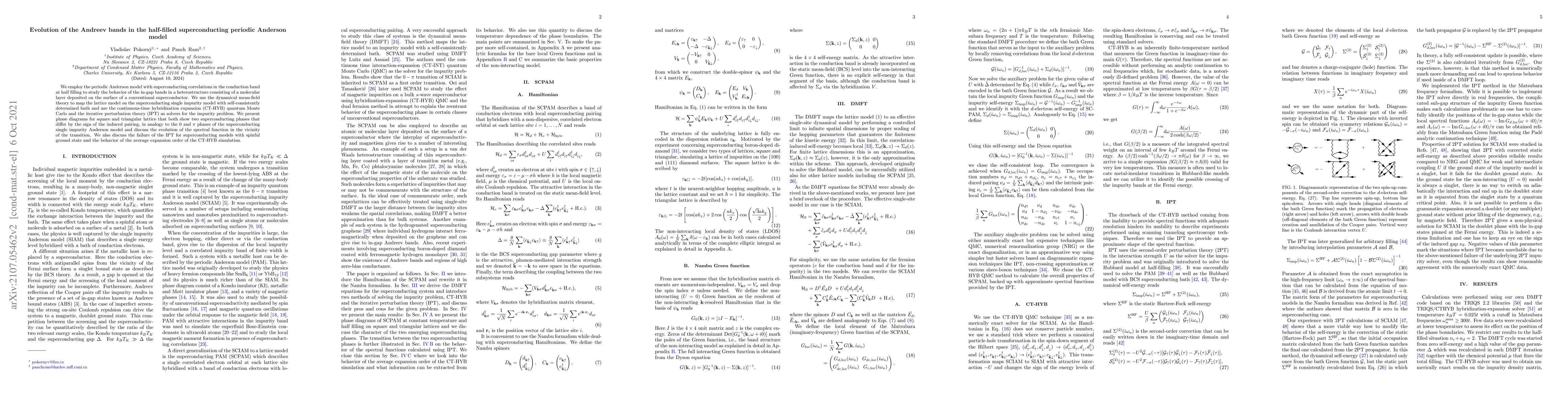 This paper investigates the evolution of Andreev bands in a half-filled superconducting periodic Anderson model using dynamical mean-field theory and quantum Monte Carlo techniques. It reveals two superconducting phases differing by pairing sign and discusses the spectral function's behavior near the transition, highlighting the limitations of iterative perturbation theory in spinful systems.