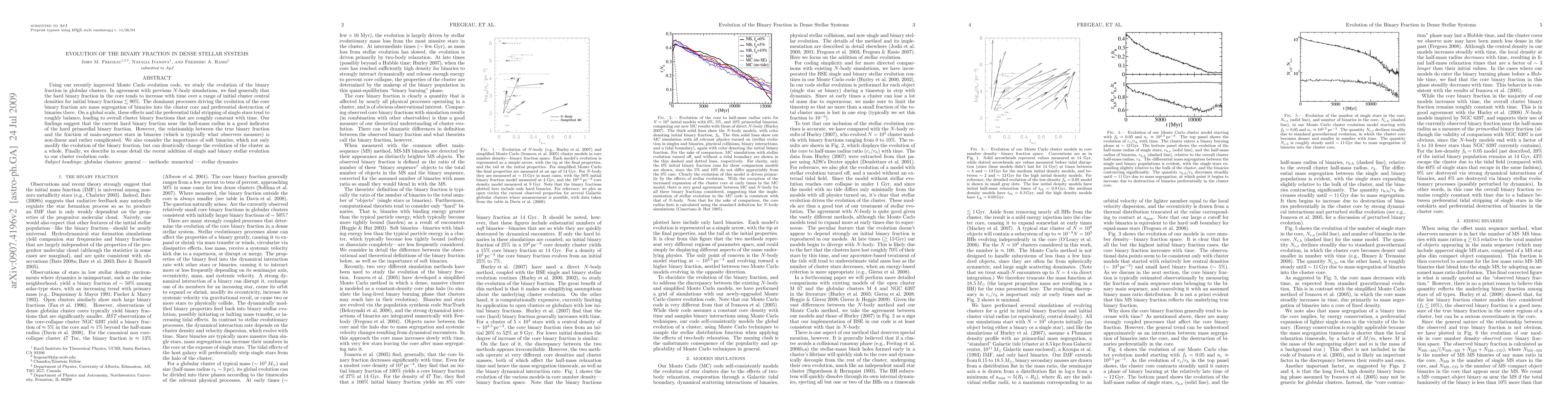 Using our recently improved Monte Carlo evolution code, we study the evolution of the binary fraction in globular clusters. In agreement with previous N-body simulations, we find generally that the hard binary fraction in the core tends to increase with time over a range of initial cluster central densities for initial binary fractions <~ 90%. The dominant processes driving the evolution of the core binary fraction are mass segregation of binaries into the cluster core and preferential destruction of binaries there. On a global scale, these effects and the preferential tidal stripping of single stars tend to roughly balance, leading to overall cluster binary fractions that are roughly constant with time. Our findings suggest that the current hard binary fraction near the half-mass radius is a good indicator of the hard primordial binary fraction. However, the relationship between the true binary fraction and the fraction of main-sequence stars in binaries (which is typically what observers measure) is non-linear and rather complicated. We also consider the importance of soft binaries, which not only modify the evolution of the binary fraction, but can drastically change the evolution of the cluster as a whole. Finally, we describe in some detail the recent addition of single and binary stellar evolution to our cluster evolution code.