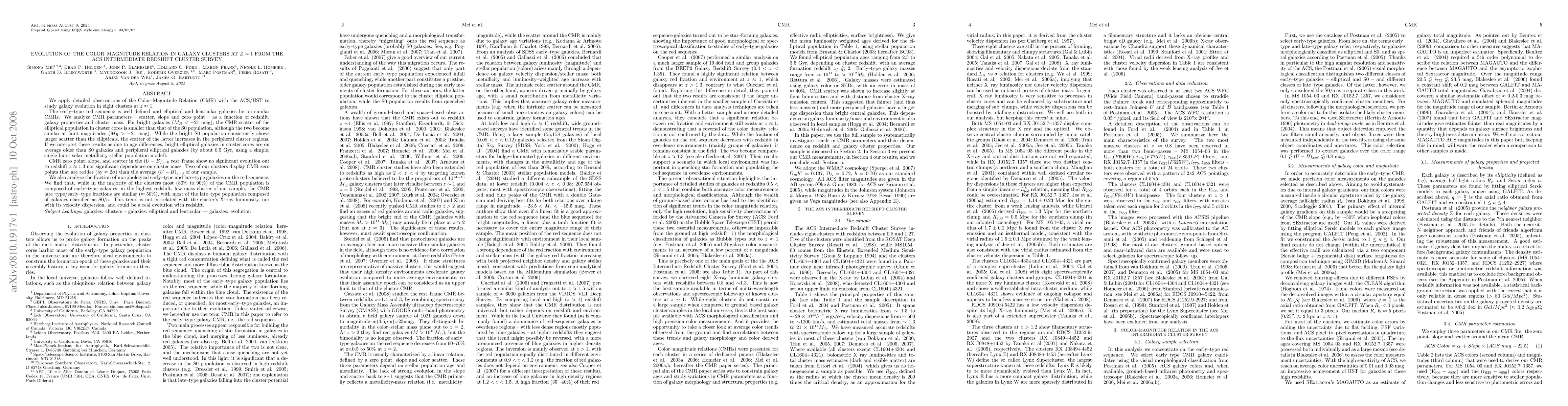 This study examines the Color-Magnitude Relation (CMR) in eight galaxy clusters at z~1 using ACS/HST observations, finding that bright elliptical galaxies in cluster cores are older than S0 galaxies by about 0.5Gyr. The CMR shows no significant evolution or dependence on cluster mass up to z~1.3.