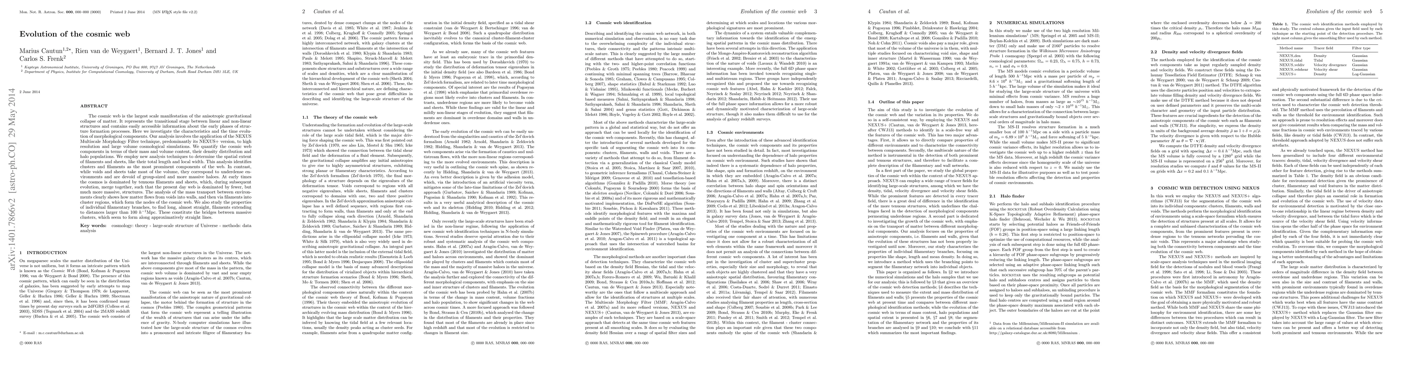 The cosmic web is the largest scale manifestation of the anisotropic gravitational collapse of matter. It represents the transitional stage between linear and non-linear structures and contains easily accessible information about the early phases of structure formation processes. Here we investigate the characteristics and the time evolution of morphological components since. Our analysis involves the application of the NEXUS Multiscale Morphology Filter (MMF) technique, predominantly its NEXUS+ version, to high resolution and large volume cosmological simulations. We quantify the cosmic web components in terms of their mass and volume content, their density distribution and halo populations. We employ new analysis techniques to determine the spatial extent of filaments and sheets, like their total length and local width. This analysis identifies cluster and filaments as the most prominent components of the web. In contrast, while voids and sheets take most of the volume, they correspond to underdense environments and are devoid of group-sized and more massive haloes. At early times the cosmos is dominated by tenuous filaments and sheets, which, during subsequent evolution, merge together, such that the present day web is dominated by fewer, but much more massive, structures. The analysis of the mass transport between environments clearly shows how matter flows from voids into walls, and then via filaments into cluster regions, which form the nodes of the cosmic web. We also study the properties of individual filamentary branches, to find long, almost straight, filaments extending to distances larger than 100Mpc/h. These constitute the bridges between massive clusters, which seem to form along approximatively straight lines.