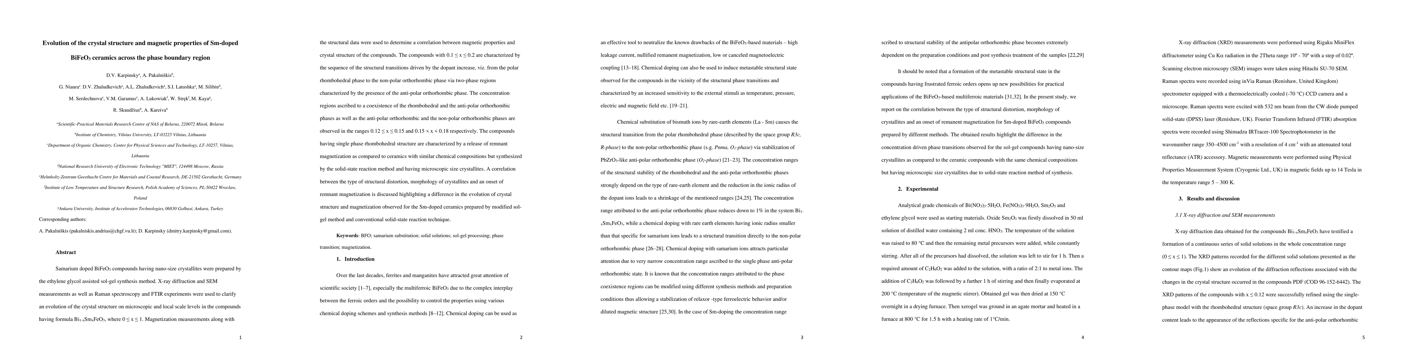 Samarium doped BiFeO3 compounds having nano-size crystallites were prepared by the ethylene glycol assisted sol-gel synthesis method. X-ray diffraction and SEM measurements as well as Raman spectroscopy and FTIR experiments were used to clarify the evolution of the crystal structure on microscopic and local scale levels in the compounds having formula Bi1-xSmxFeO3, where x equals from 0 to 1. Magnetization measurements along with the structural data were used to determine a correlation between magnetic properties and crystal structure of the compounds. The compounds with from x 0.1-0.2 are characterized by the sequence of the structural transitions driven by the dopant increase, from the polar rhombohedral phase to the non-polar orthorhombic phase via two-phase regions characterized by the presence of the anti-polar orthorhombic phase. The concentration regions ascribed to a coexistence of the rhombohedral and the anti-polar orthorhombic phases as well as theanti-polar orthorhombic and the non-polar orthorhombic phases are observed in the ranges from 0.12 to 0.15 and from 0.15 to 0.18 respectively. The compounds having single-phase rhombohedral structure are characterized by a release of remnant magnetization as compared to ceramics with similar chemical compositions but synthesized by the solid-state reaction method and having microscopic size crystallites. A correlation between the type of structural distortion, morphology of crystallites and an onset of remnant magnetization is discussed highlighting a difference in the evolution of crystal structure and magnetization observed for the Sm-doped ceramics prepared by modified sol-gel method and conventional solid-state reaction technique.