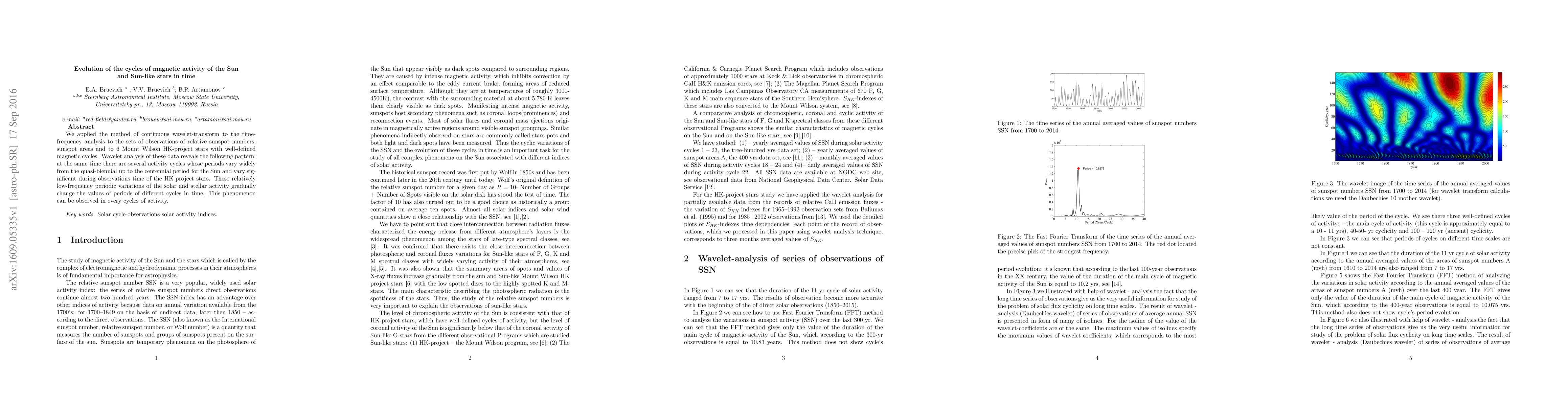 This study uses continuous wavelet-transform to analyze sunspot data and magnetic cycles of the Sun and six Sun-like stars, revealing multiple activity cycles with periods ranging from quasi-biennial to centennial. These cycles show significant variations in their periods over time, indicating a gradual change in the values of different cycles' periods.