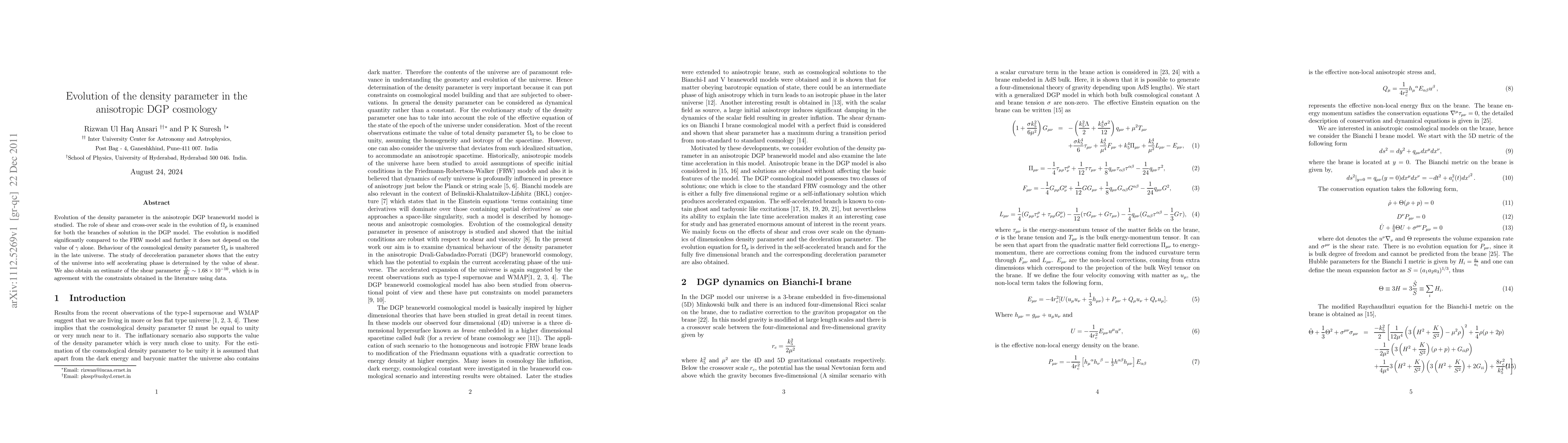 Evolution of the density parameter in the anisotropic DGP braneworld model is studied. The role of shear and cross-over scale in the evolution of $\Omega_\rho$ is examined for both the branches of solution in the DGP model. The evolution is modified significantly compared to the FRW model and further it does not depend on the value of $\gamma$ alone. Behaviour of the cosmological density parameter $\Omega_\rho$ is unaltered in the late universe. The study of decceleration parameter shows that the entry of the universe into self accelerating phase is determined by the value of shear. We also obtain an estimate of the shear parameter $\frac{\Sigma}{H_0} \sim 1.68 \times 10^{-10}$, which is in agreement with the constraints obtained in the literature using data.