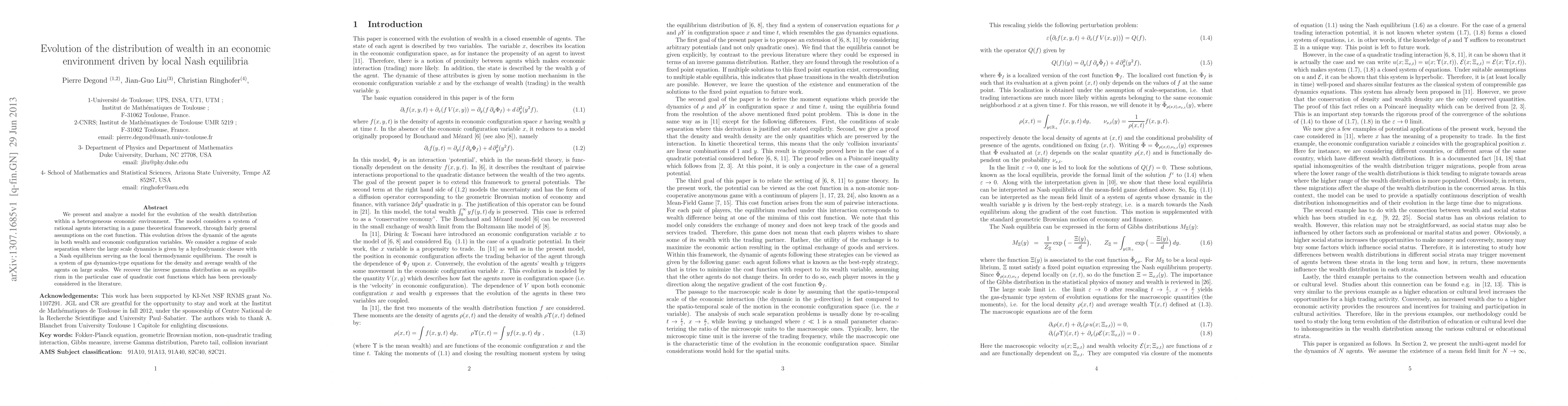 We present and analyze a model for the evolution of the wealth distribution within a heterogeneous economic environment. The model considers a system of rational agents interacting in a game theoretical framework, through fairly general assumptions on the cost function. This evolution drives the dynamic of the agents in both wealth and economic configuration variables. We consider a regime of scale separation where the large scale dynamics is given by a hydrodynamic closure with a Nash equilibrium serving as the local thermodynamic equilibrium. The result is a system of gas dynamics-type equations for the density and average wealth of the agents on large scales. We recover the inverse gamma distribution as an equilibrium in the particular case of quadratic cost functions which has been previously considered in the literature.