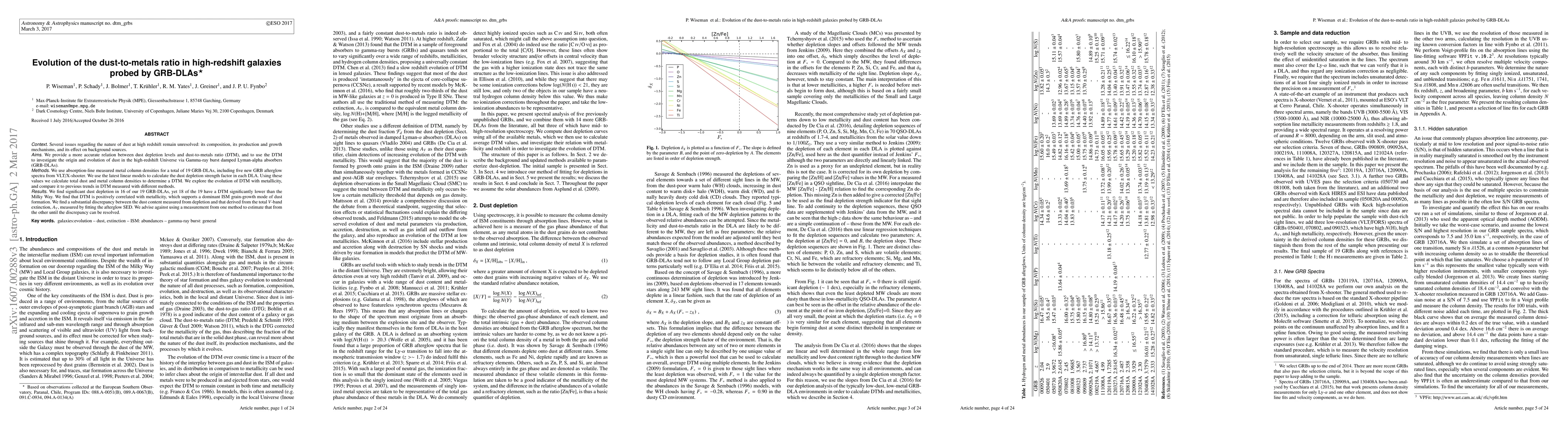 Context. Several issues regarding the nature of dust at high redshift remain unresolved: its composition, its production and growth mechanisms, and its effect on background sources. Aims. We provide a more accurate relation between dust depletion levels and dust-to-metals ratio (DTM), and to use the DTM to investigate the origin and evolution of dust in the high-redshift Universe via Gamma-ray burst damped Lyman-alpha absorbers (GRB-DLAs). Methods. We use absorption-line measured metal column densities for a total of 19 GRB-DLAs, including five new GRB afterglow spectra from VLT/X-shooter. We use the latest linear models to calculate the dust depletion strength factor in each DLA. Using these values we calculate total dust and metal column densities to determine a DTM. We explore the evolution of DTM with metallicity, and compare it to previous trends in DTM measured with different methods. Results. We find significant dust depletion in 16 of our 19 GRB-DLAs, yet 18 of the 19 have a DTM significantly lower than the Milky Way. We find that DTM is positively correlated with metallicity, which supports a dominant ISM grain-growth mode of dust formation. We find a substantial discrepancy between the dust content measured from depletion and that derived from the total V-band extinction, $A_V$ , measured by fitting the afterglow SED. We advise against using a measurement from one method to estimate that from the other until the discrepancy can be resolved.