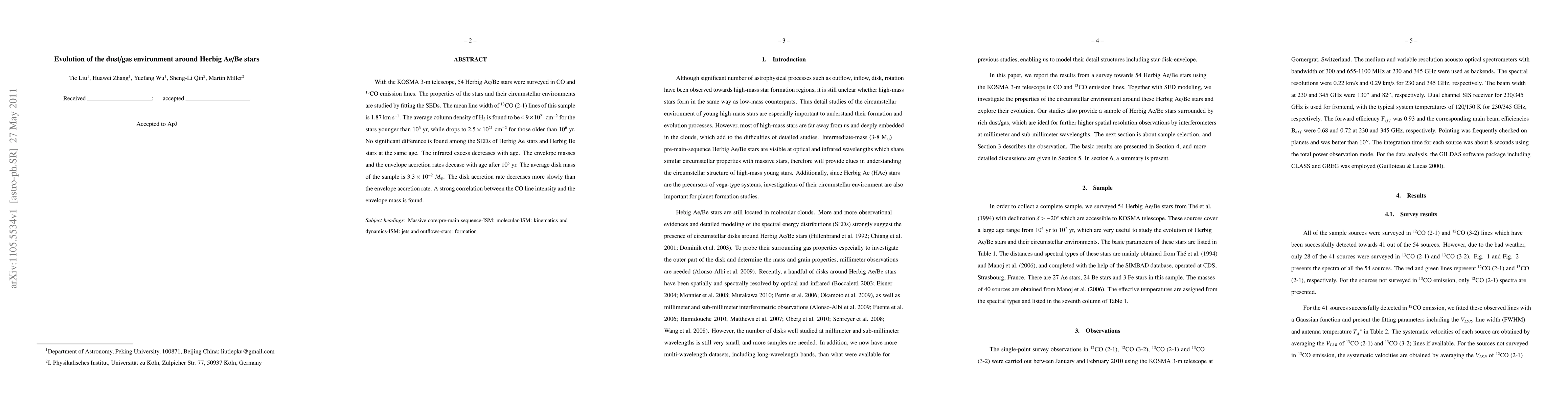 With the KOSMA 3-m telescope, 54 Herbig Ae/Be stars were surveyed in CO and $^{13}$CO emission lines. The properties of the stars and their circumstellar environments are studied by fitting the SEDs. The mean line width of $^{13}$CO (2-1) lines of this sample is 1.87 km s$^{-1}$. The average column density of H$_{2}$ is found to be $4.9\times10^{21}$ cm$^{-2}$ for the stars younger than $10^{6}$ yr, while drops to $2.5\times10^{21}$ cm$^{-2}$ for those older than $10^{6}$ yr. No significant difference is found among the SEDs of Herbig Ae stars and Herbig Be stars at the same age. The infrared excess decreases with age. The envelope masses and the envelope accretion rates decease with age after $10^{5}$ yr. The average disk mass of the sample is $3.3\times10^{-2} M_{\sun}$. The disk accretion rate decreases more slowly than the envelope accretion rate. A strong correlation between the CO line intensity and the envelope mass is found.