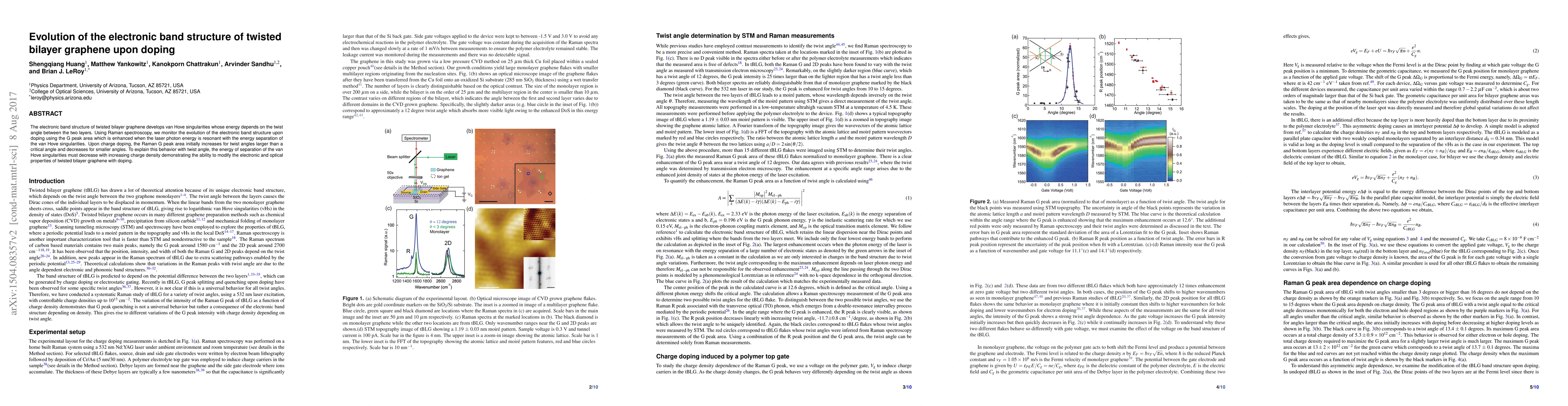 Summary: Research shows that the electronic band structure of twisted bilayer graphene, which develops van Hove singularities, can be altered by doping. Raman spectroscopy reveals that the G peak area increases with doping for larger twist angles and decreases for smaller angles, indicating a twist angle-dependent modification of electronic and optical properties.