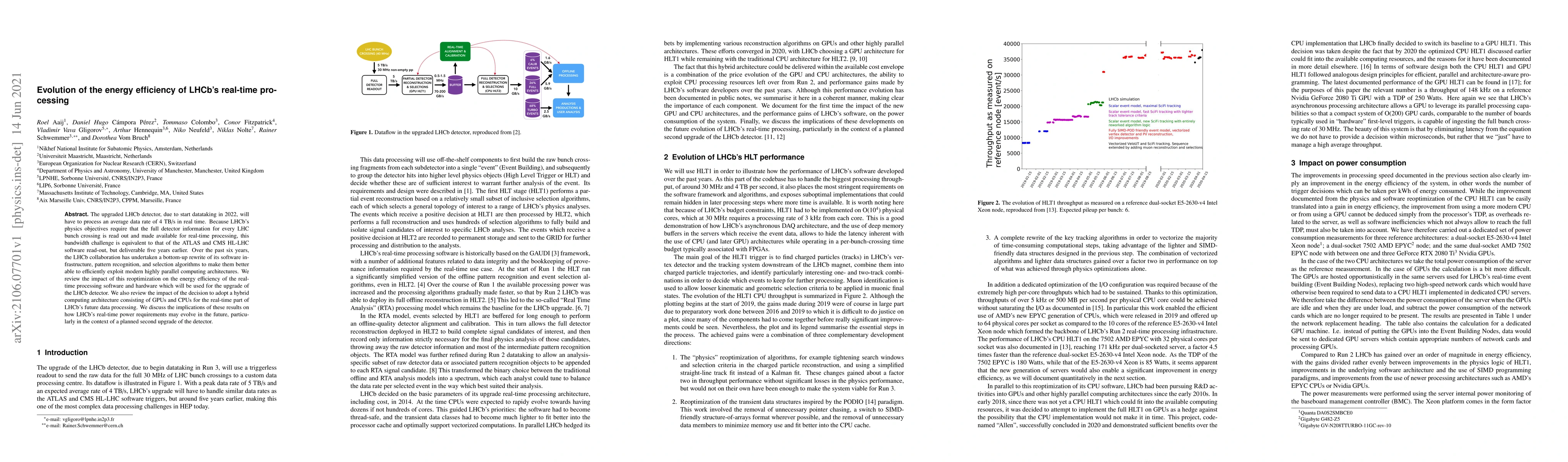 The upgraded LHCb detector, due to start datataking in 2022, will have to process an average data rate of 4~TB/s in real time. Because LHCb's physics objectives require that the full detector information for every LHC bunch crossing is read out and made available for real-time processing, this bandwidth challenge is equivalent to that of the ATLAS and CMS HL-LHC software read-out, but deliverable five years earlier. Over the past six years, the LHCb collaboration has undertaken a bottom-up rewrite of its software infrastructure, pattern recognition, and selection algorithms to make them better able to efficiently exploit modern highly parallel computing architectures. We review the impact of this reoptimization on the energy efficiency of the real-time processing software and hardware which will be used for the upgrade of the LHCb detector. We also review the impact of the decision to adopt a hybrid computing architecture consisting of GPUs and CPUs for the real-time part of LHCb's future data processing. We discuss the implications of these results on how LHCb's real-time power requirements may evolve in the future, particularly in the context of a planned second upgrade of the detector.