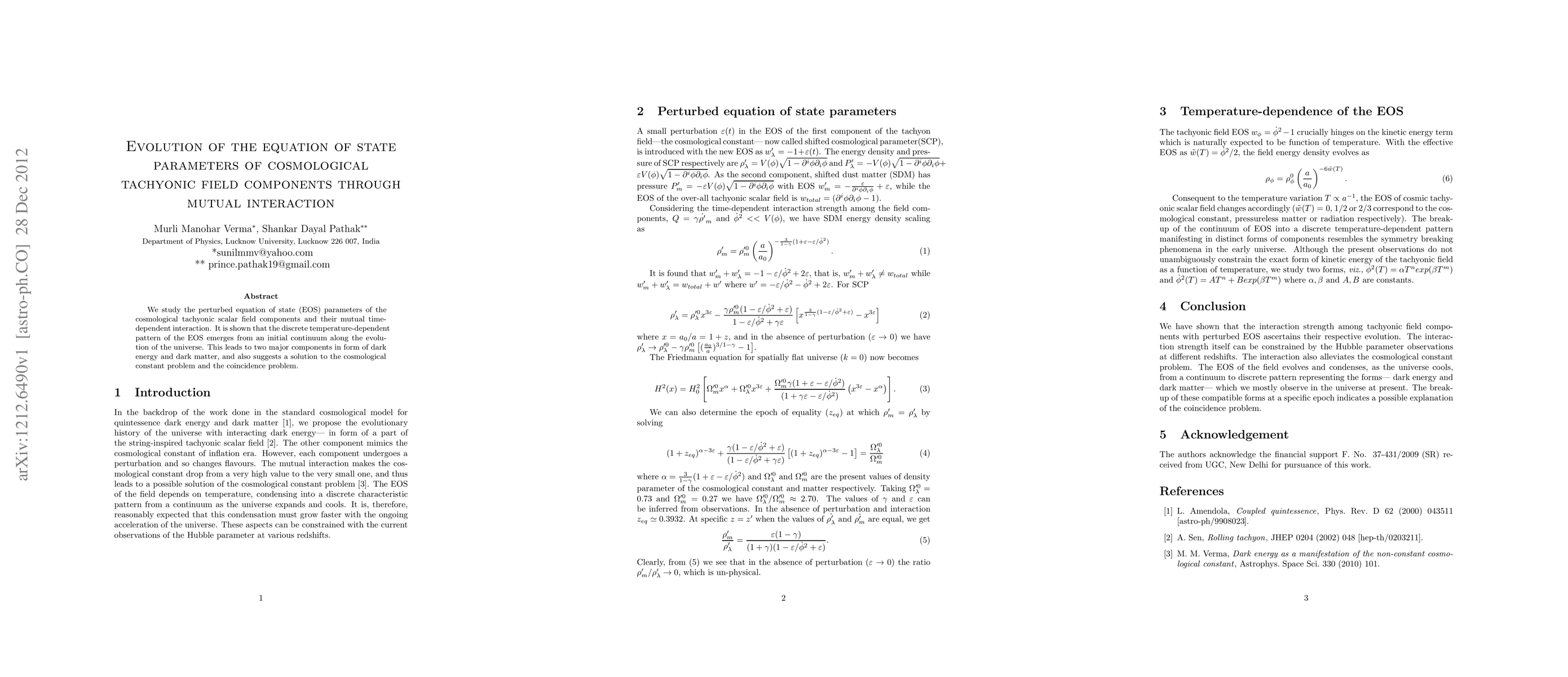 We study the perturbed equation of state (EOS) parameters of the cosmological tachyonic scalar field components and their mutual time-dependent interaction. It is shown that the discrete temperature-dependent pattern of the EOS emerges from an initial continuum along the evolution of the universe. This leads to two major components in form of dark energy and dark matter, and also suggests a solution to the cosmological constant problem and the coincidence problem.