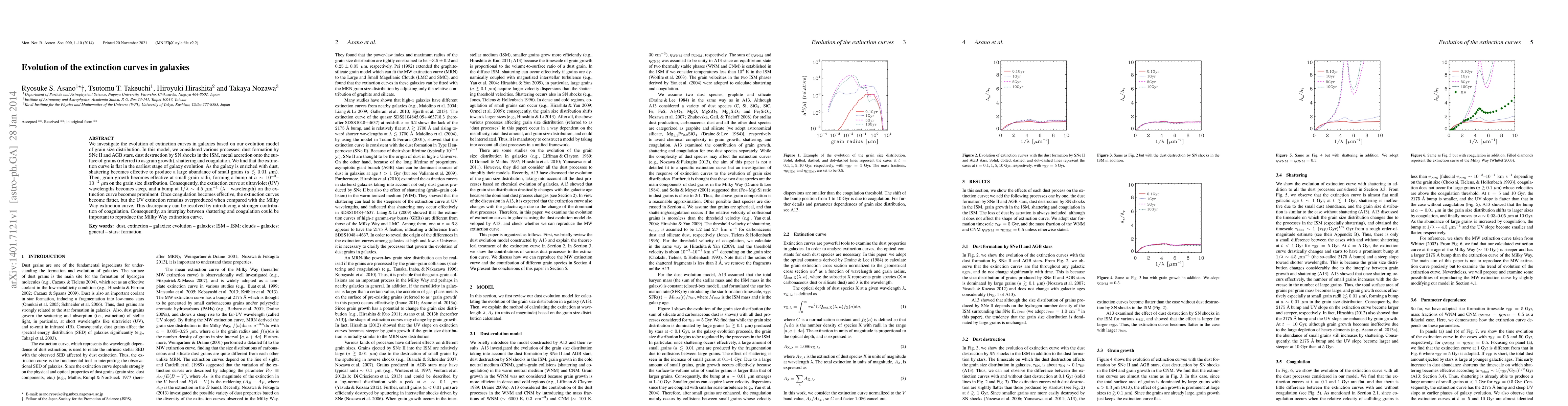 The extinction curve in galaxies evolves from flat to steep due to grain growth and coagulation processes, with a bump at 1/λ ~ 4.5 μm^-1, which can be resolved by introducing stronger coagulation effects.