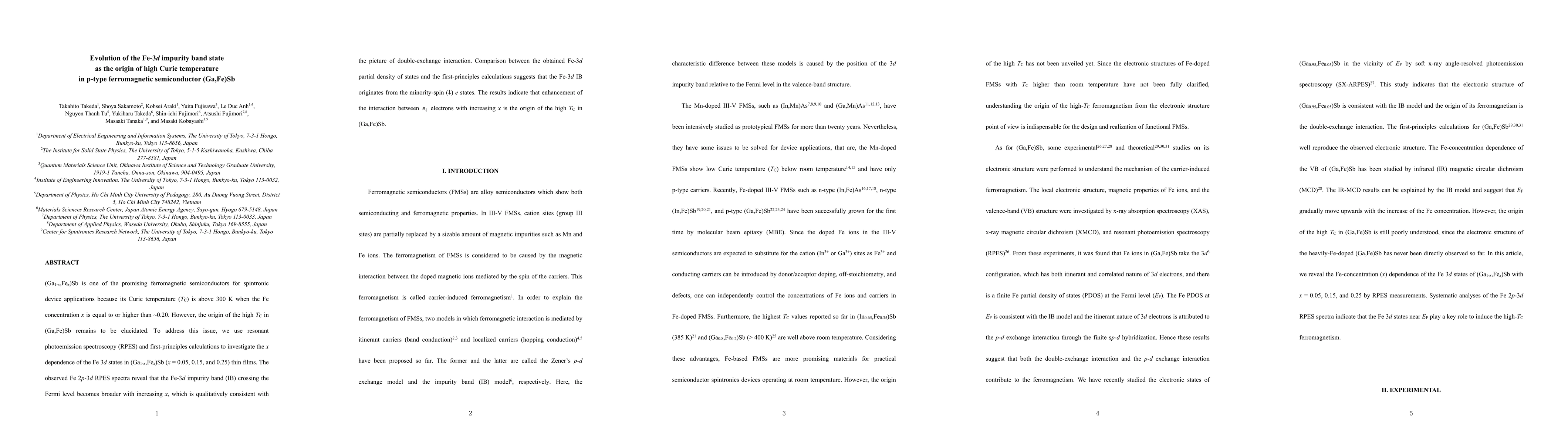This paper investigates the origin of high Curie temperature in p-type ferromagnetic semiconductor (Ga,Fe)Sb using resonant photoemission spectroscopy and first-principles calculations. The Fe-3$d$ impurity band crossing the Fermi level broadens with increasing Fe concentration, indicating enhanced interaction between minority-spin electrons, which is identified as the origin of the high Curie temperature.