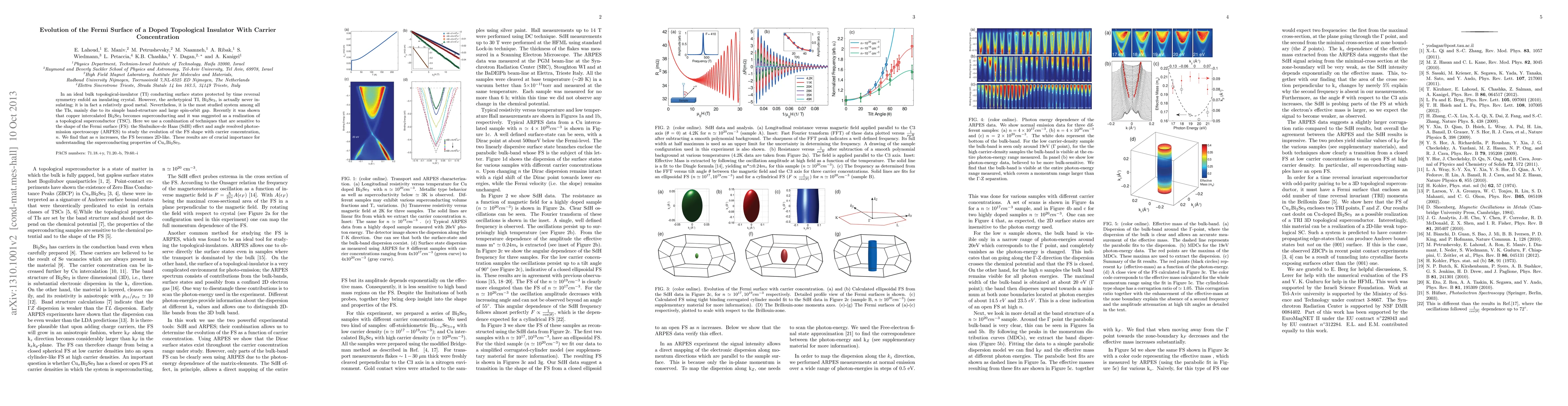 This study investigates the evolution of the Fermi surface in doped Bi2Se3 using Shubnikov-de Haas effect and ARPES, revealing that increased carrier concentration transforms the Fermi surface into a 2D-like structure. These findings are vital for understanding the superconducting properties of copper intercalated Bi2Se3.